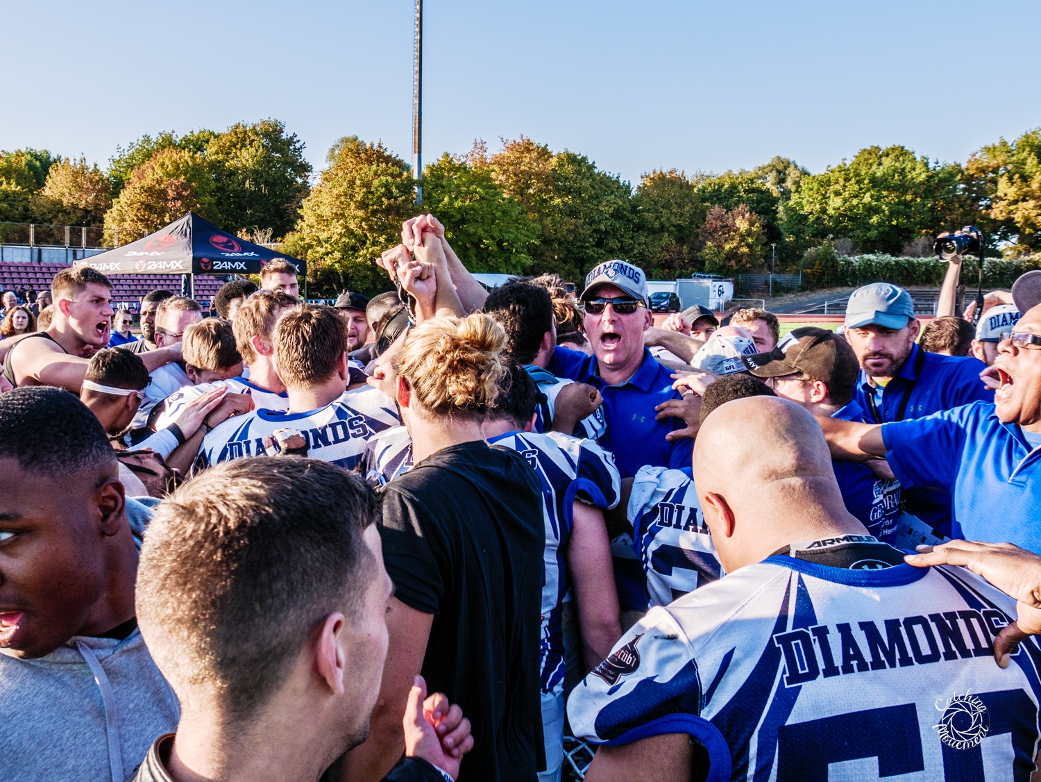 But here are some photos of the game and the players in the after game huddle to talk about the season, the win, the promotion and what is to come.