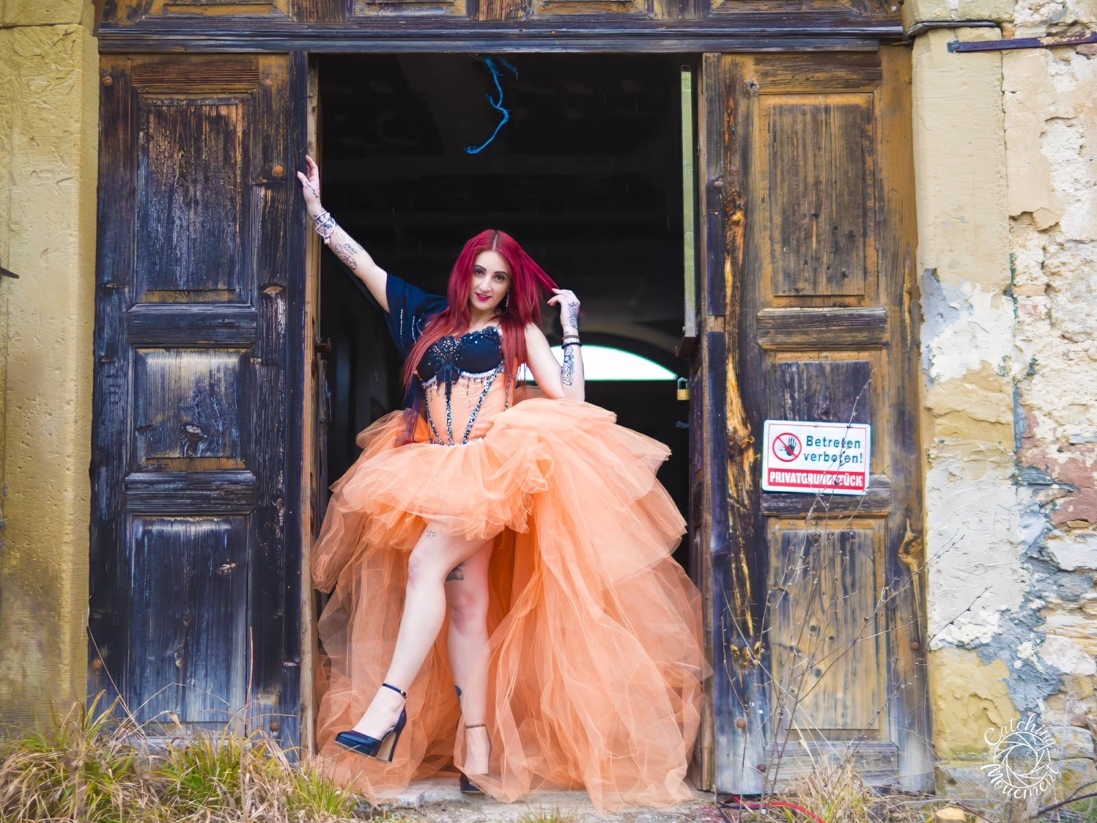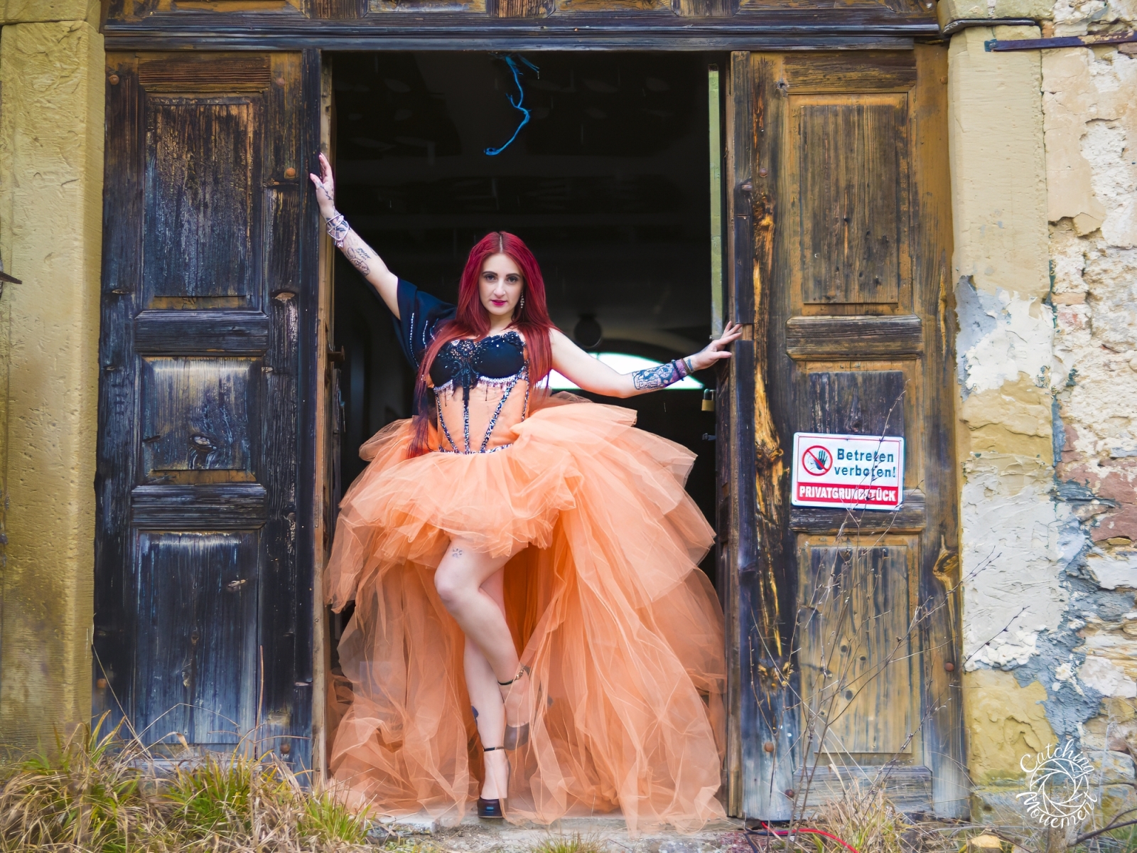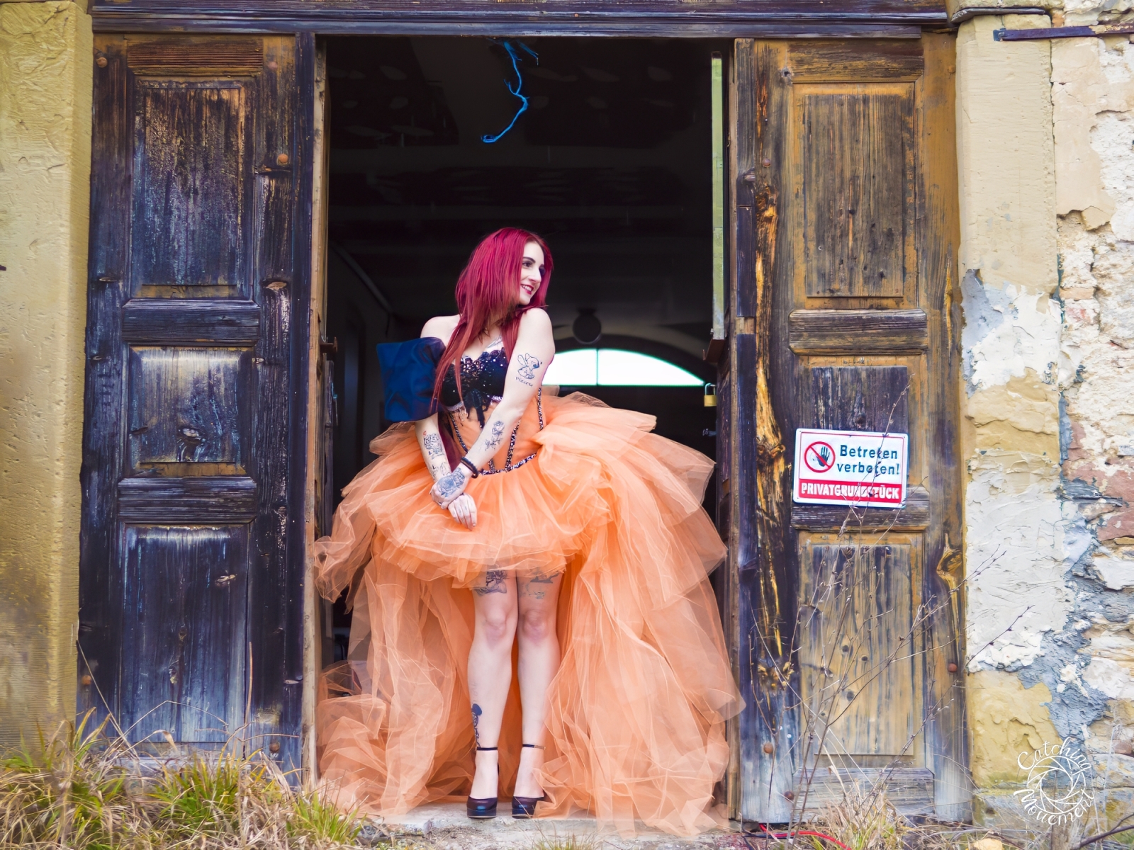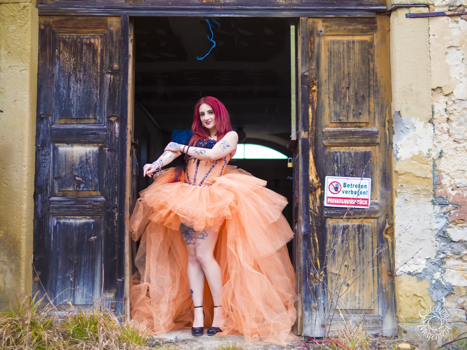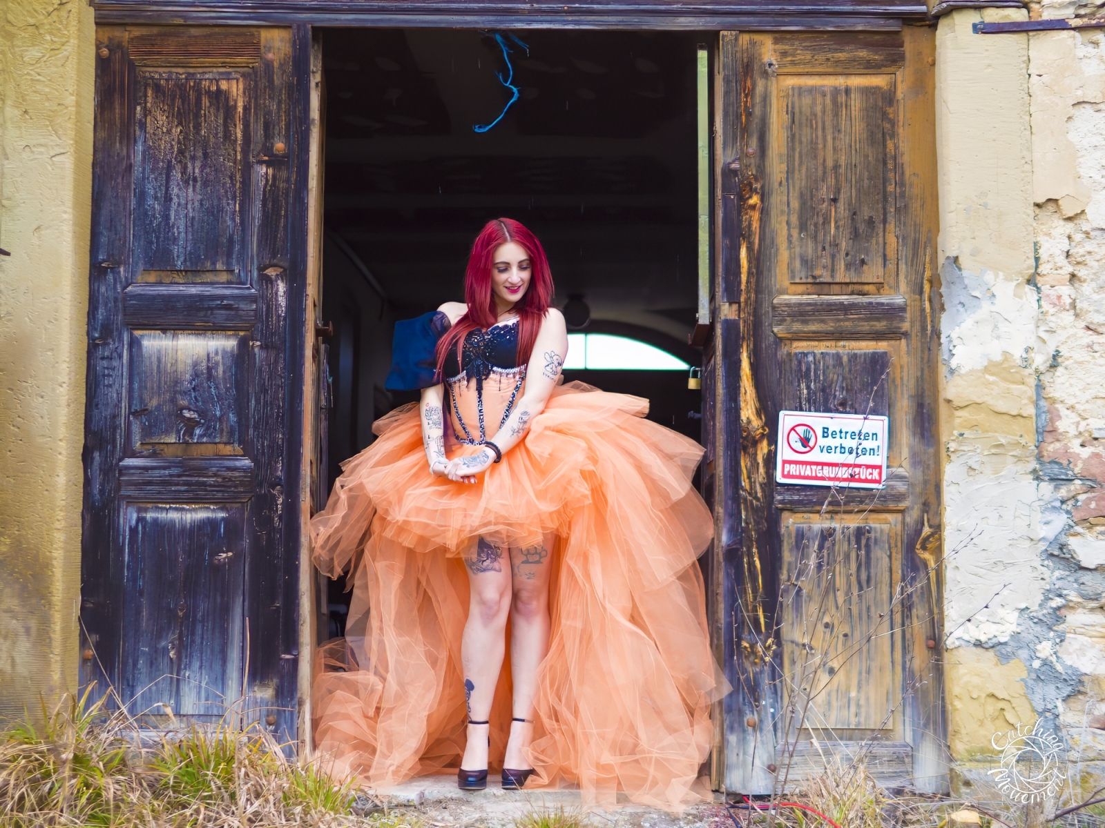 First, we went into a room with a blue wall and a long blue curtain. The corner where we took the photos nicely concealed the fact that we were actually in a lost place and that the house had been uninhabited for many years. The contrast between the blue and the orange of the dress really stood out.
