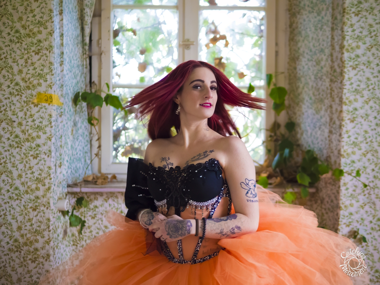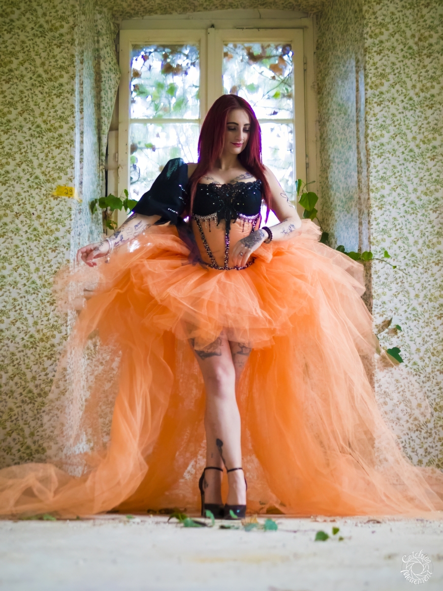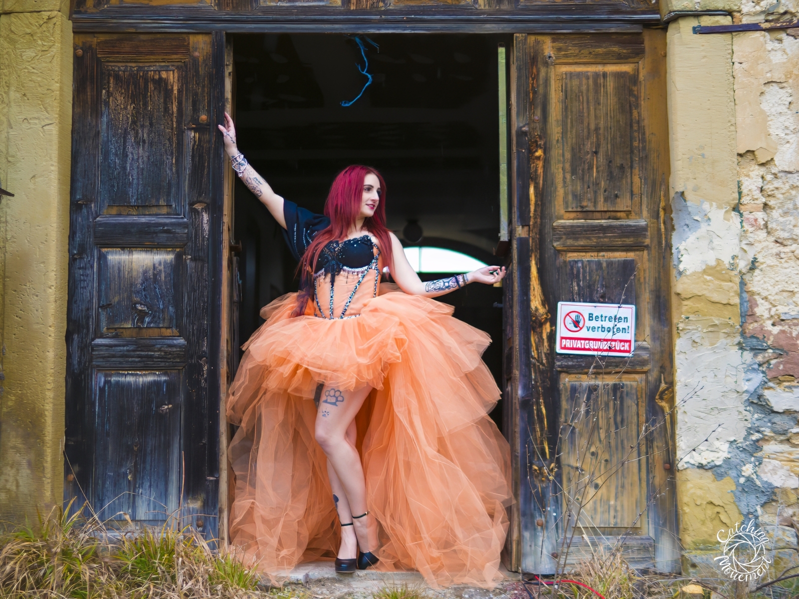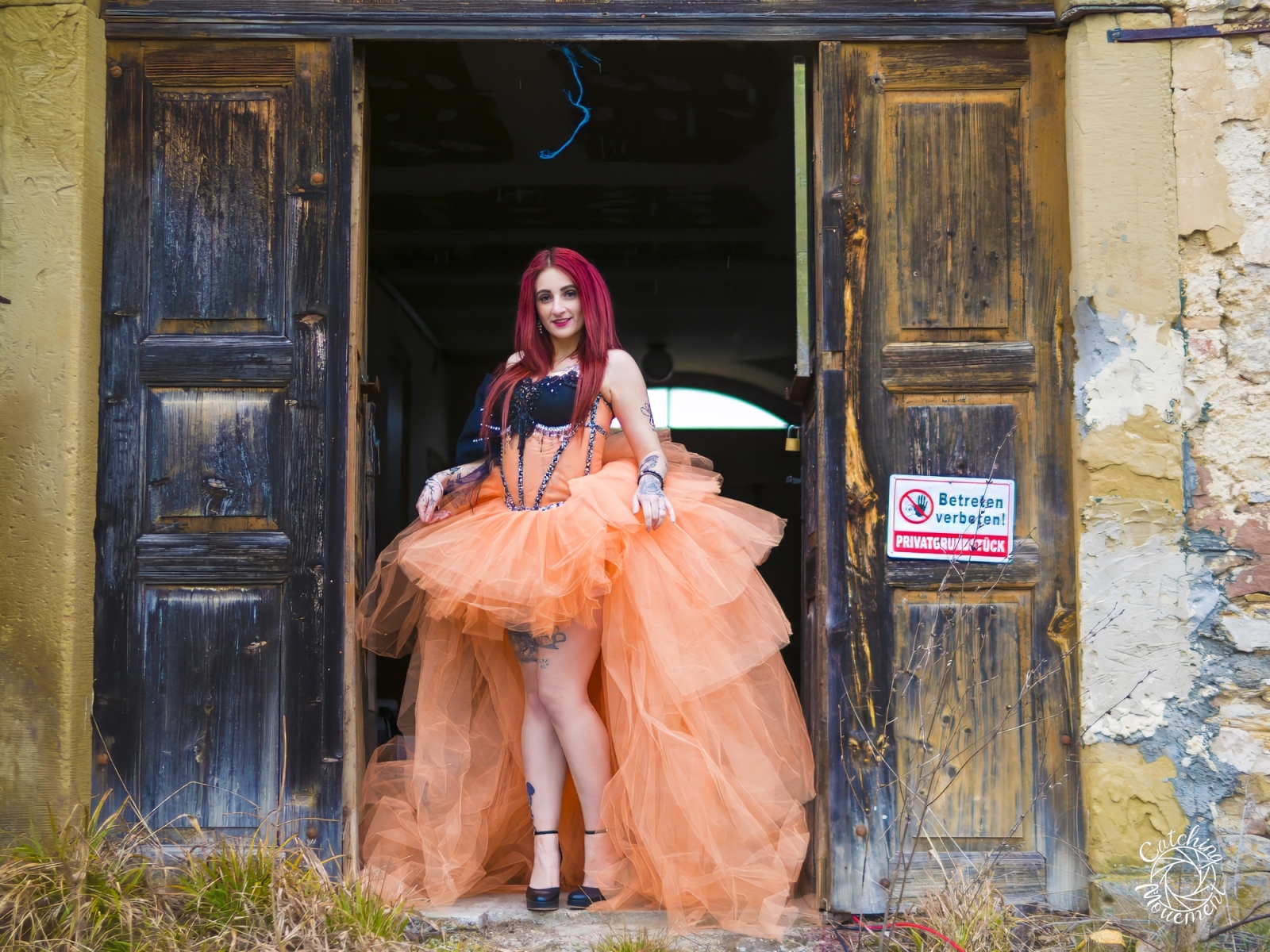 First, we went into a room with a blue wall and a long blue curtain. The corner where we took the photos nicely concealed the fact that we were actually in a lost place and that the house had been uninhabited for many years. The contrast between the blue and the orange of the dress really stood out.