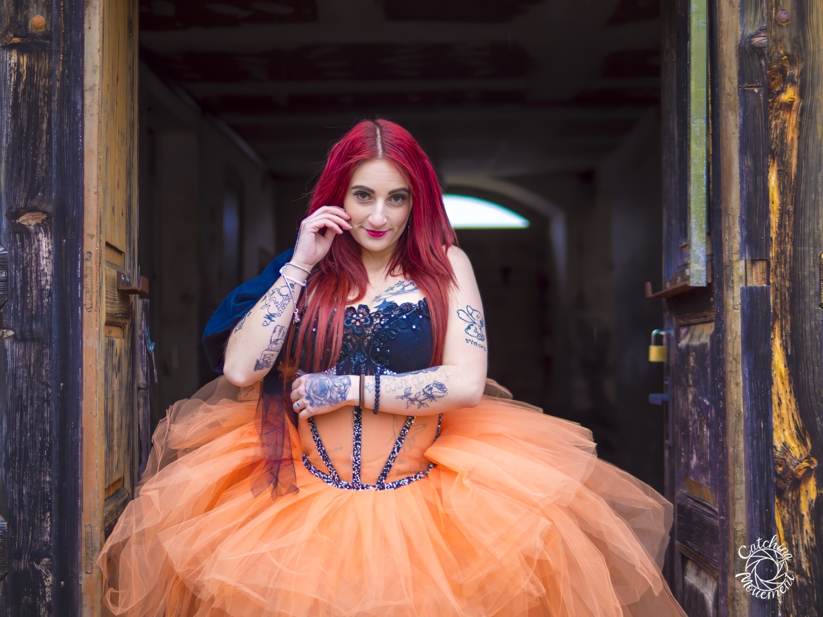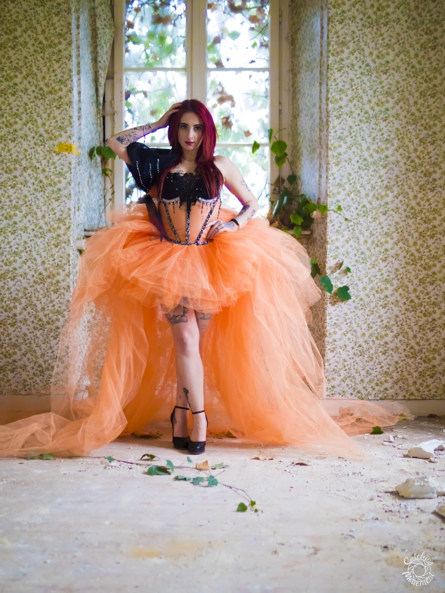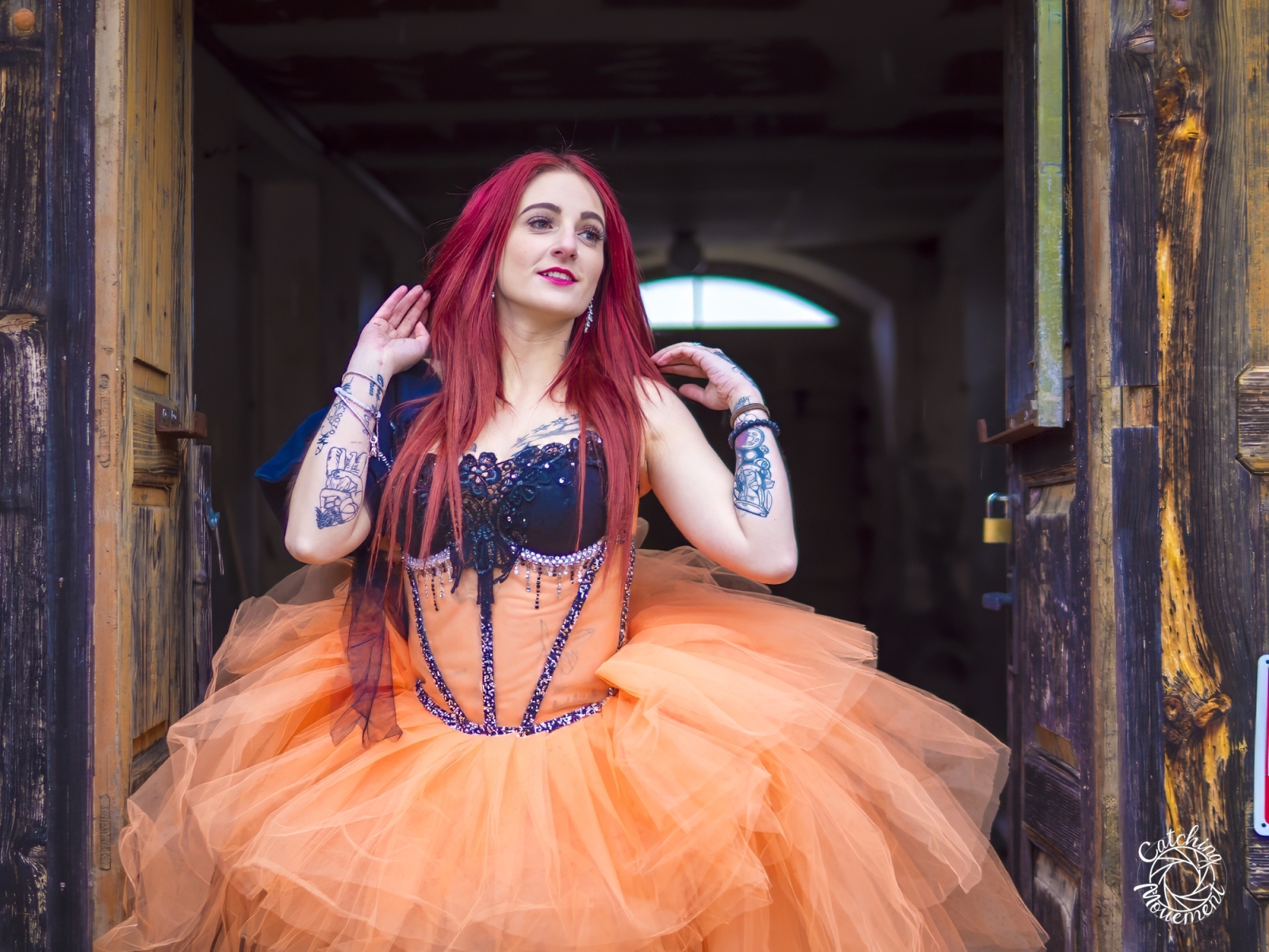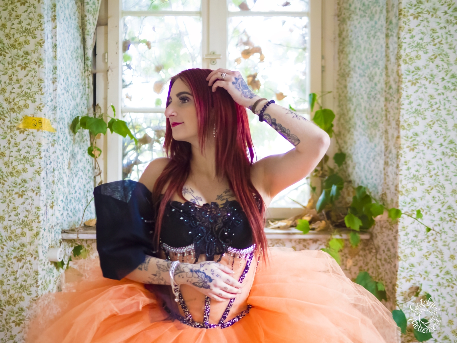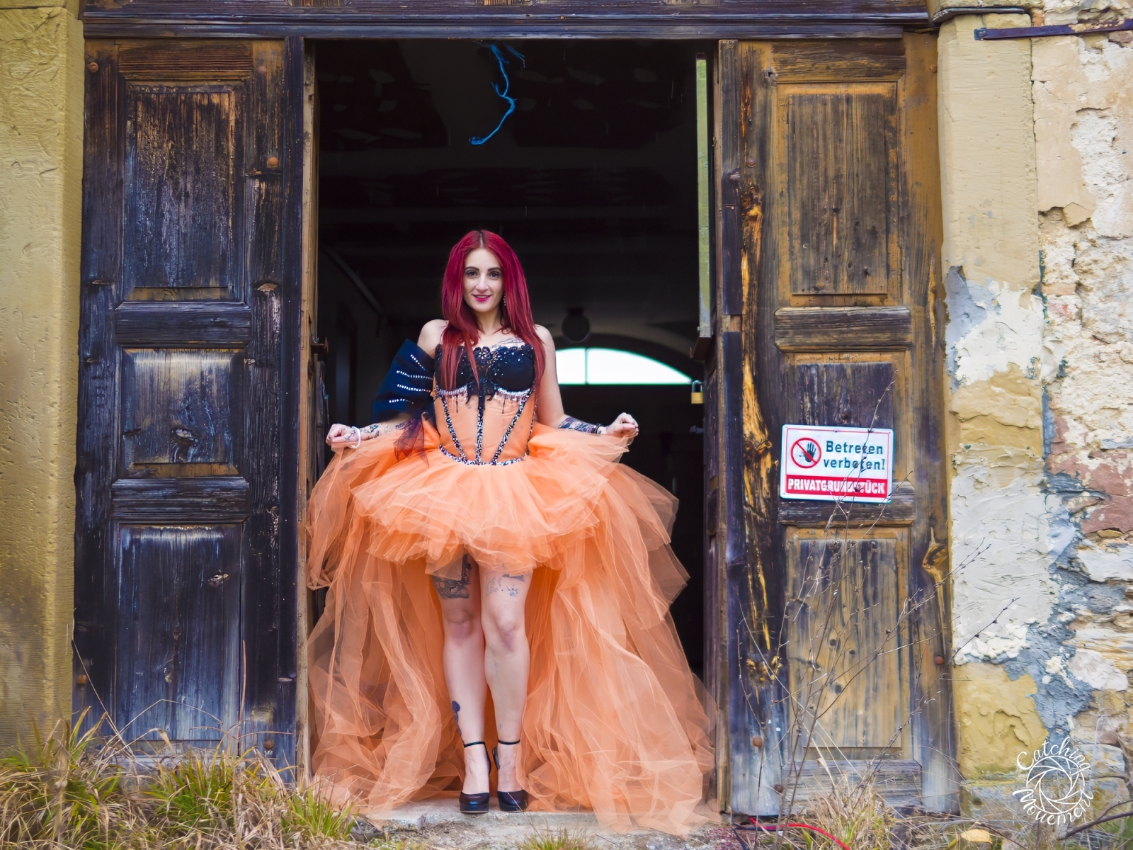 First, we went into a room with a blue wall and a long blue curtain. The corner where we took the photos nicely concealed the fact that we were actually in a lost place and that the house had been uninhabited for many years. The contrast between the blue and the orange of the dress really stood out.