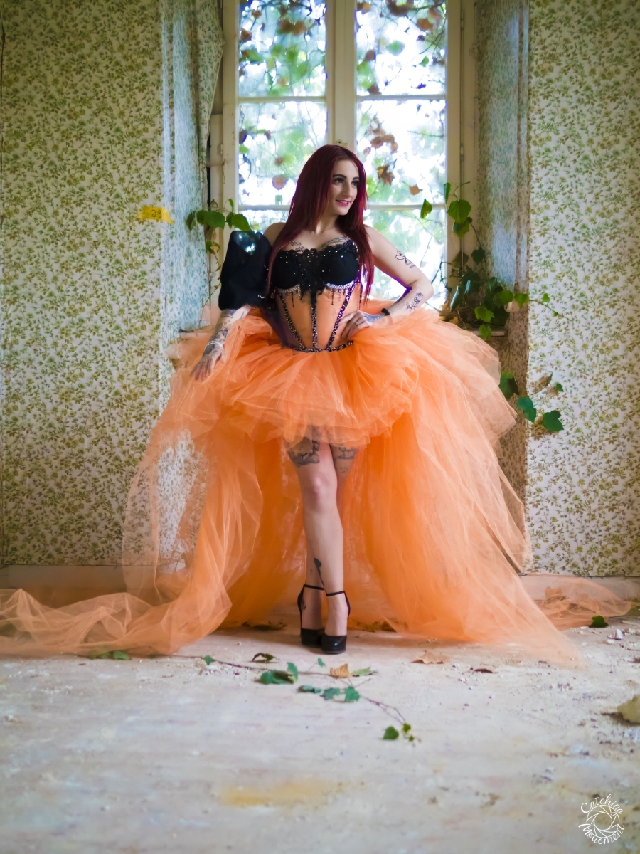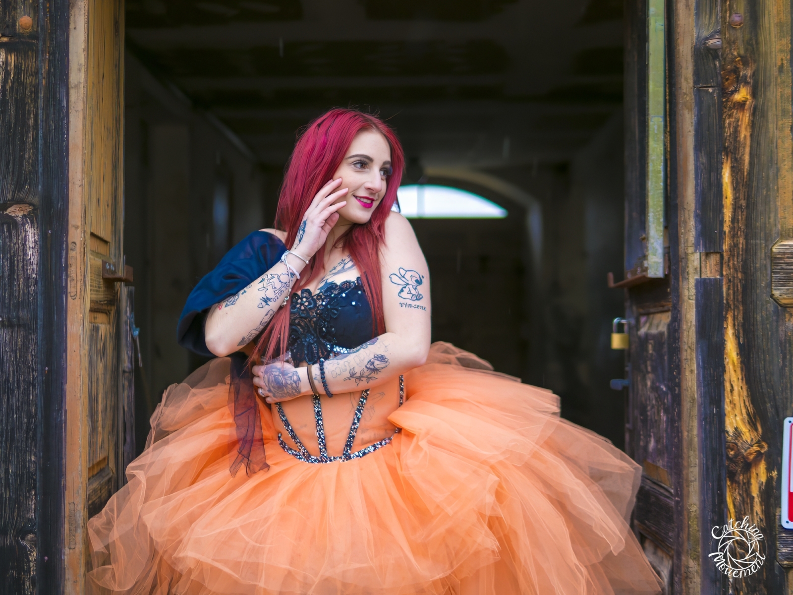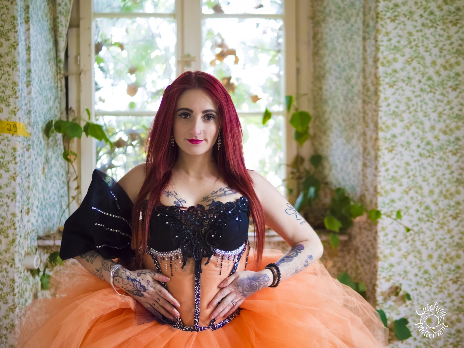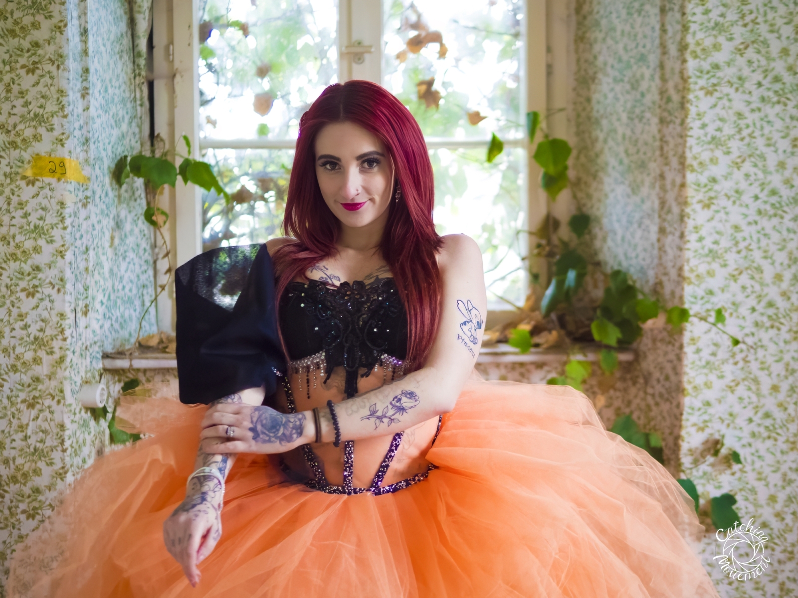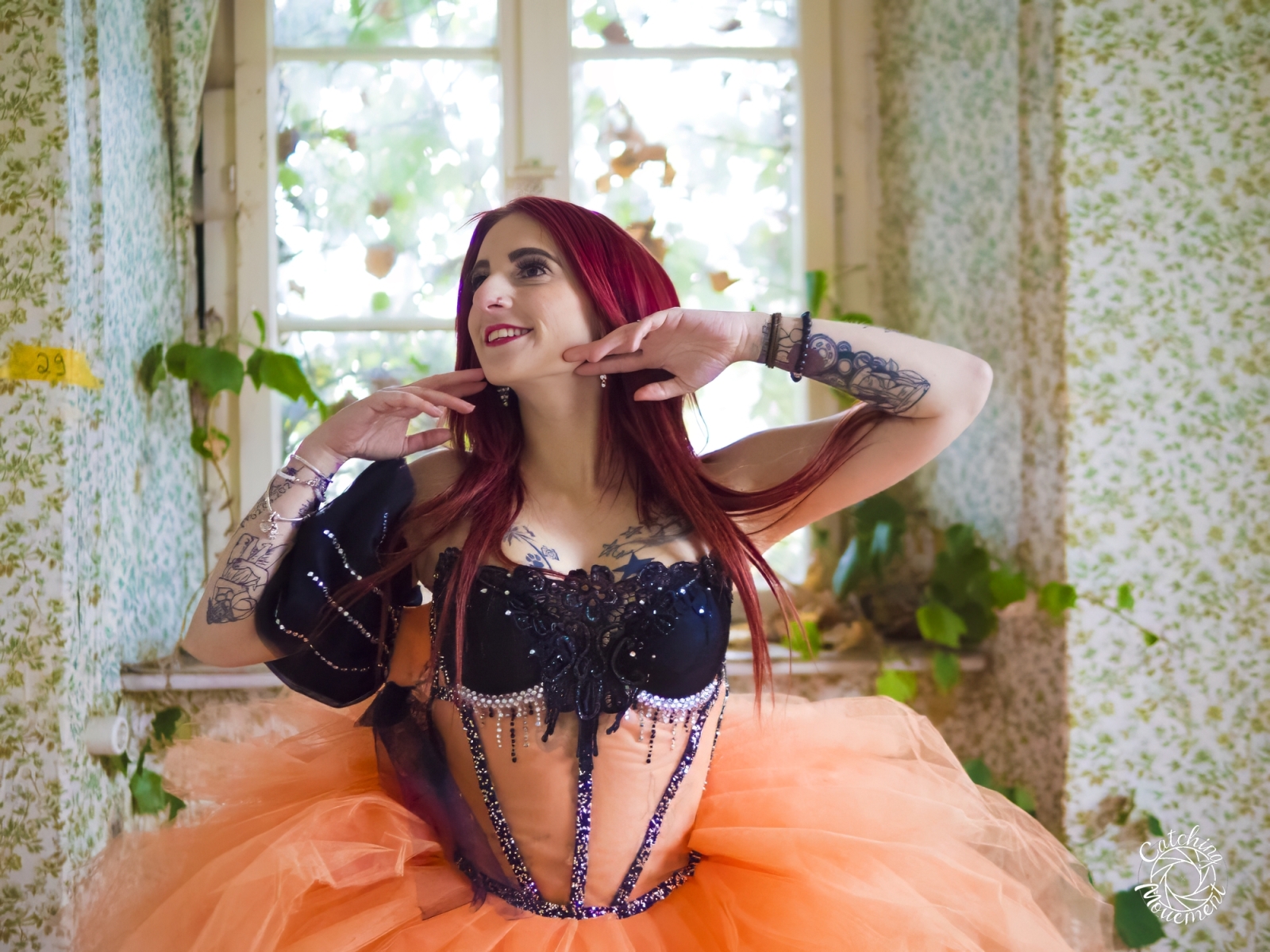 First, we went into a room with a blue wall and a long blue curtain. The corner where we took the photos nicely concealed the fact that we were actually in a lost place and that the house had been uninhabited for many years. The contrast between the blue and the orange of the dress really stood out.