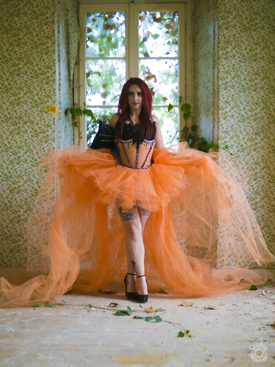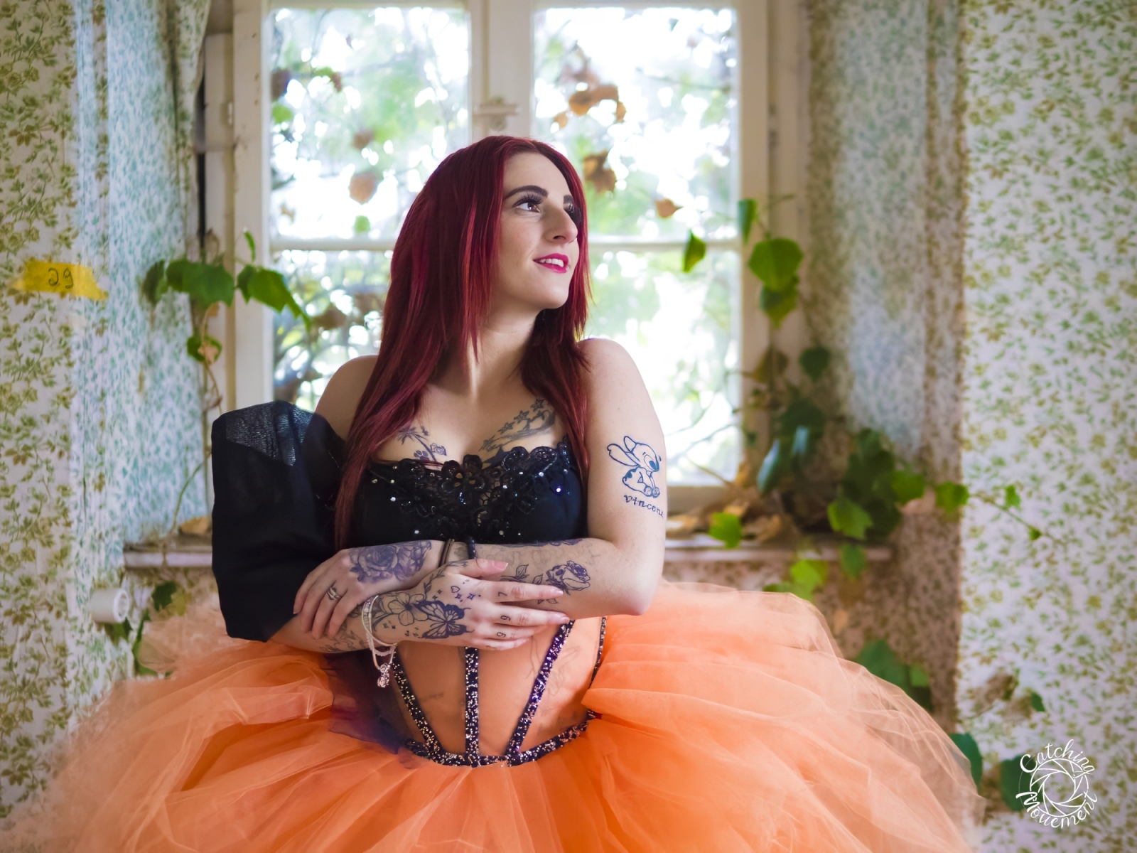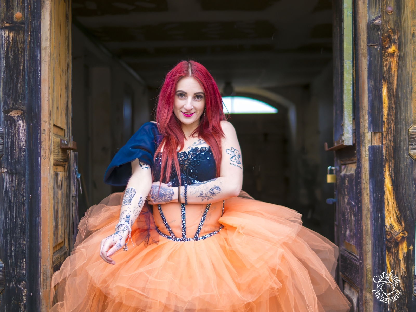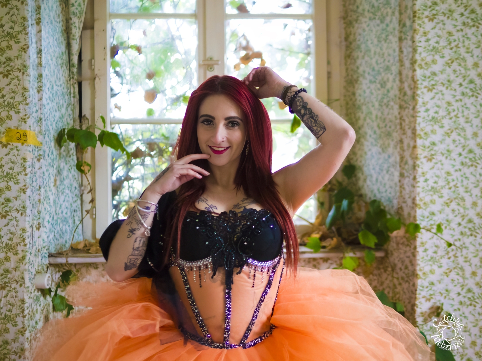 First, we went into a room with a blue wall and a long blue curtain. The corner where we took the photos nicely concealed the fact that we were actually in a lost place and that the house had been uninhabited for many years. The contrast between the blue and the orange of the dress really stood out.
