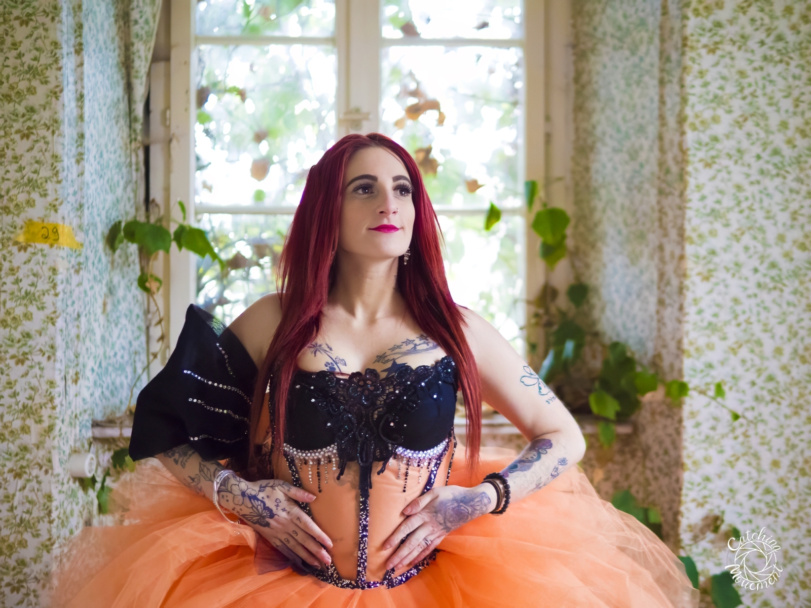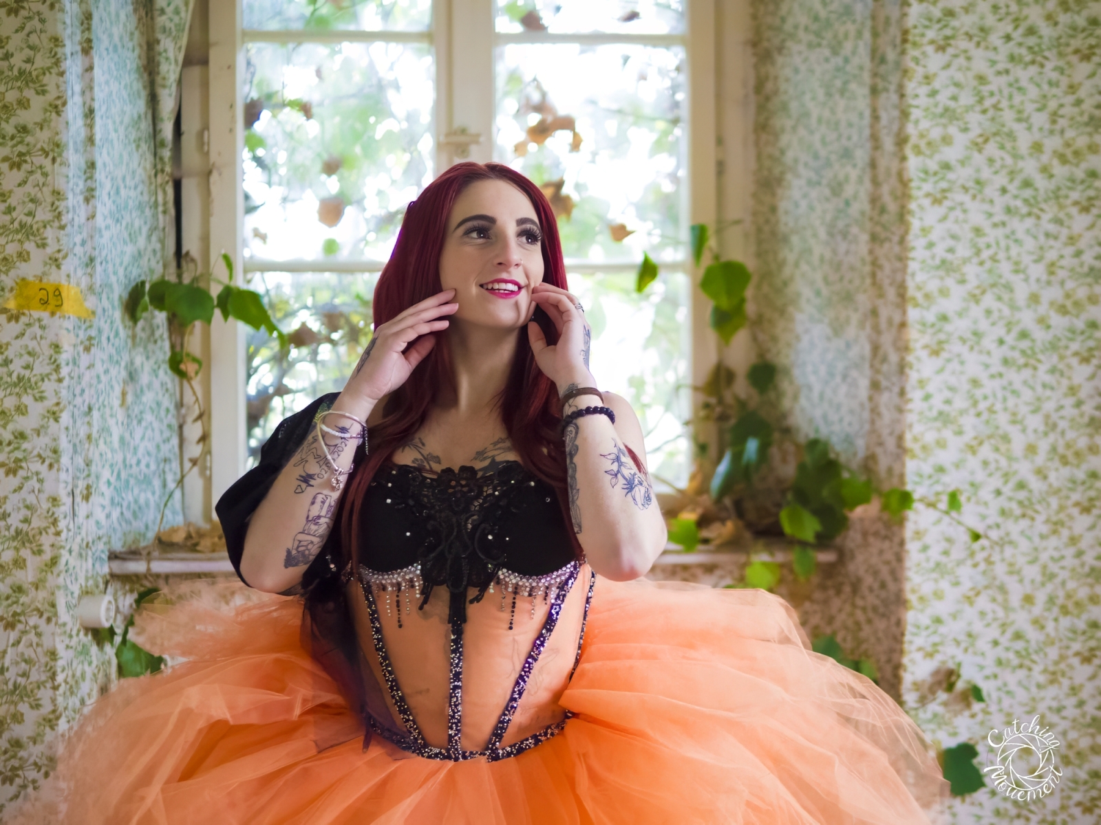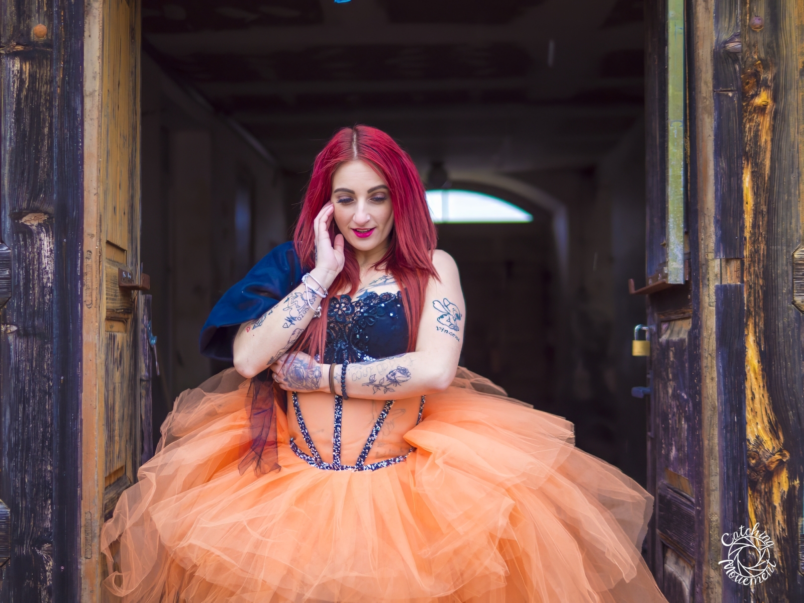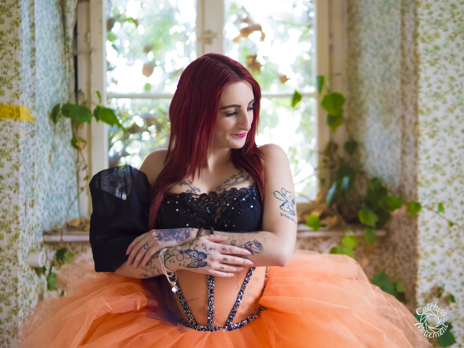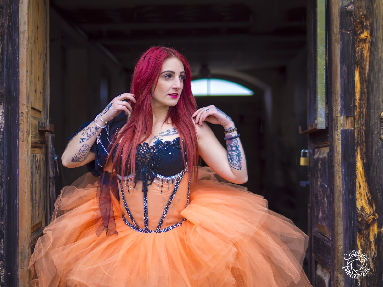First, we went into a room with a blue wall and a long blue curtain. The corner where we took the photos nicely concealed the fact that we were actually in a lost place and that the house had been uninhabited for many years. The contrast between the blue and the orange of the dress really stood out.