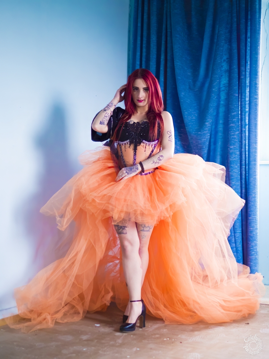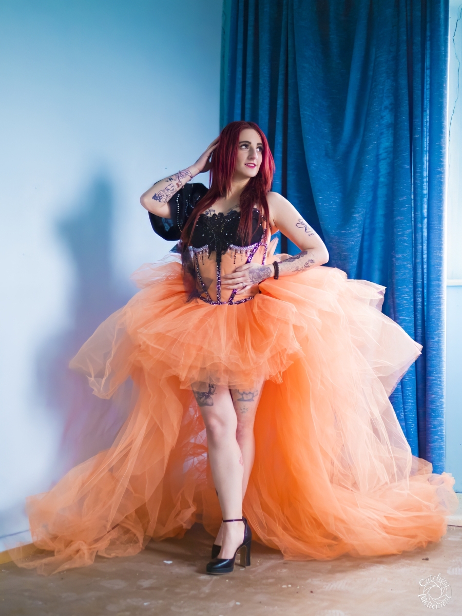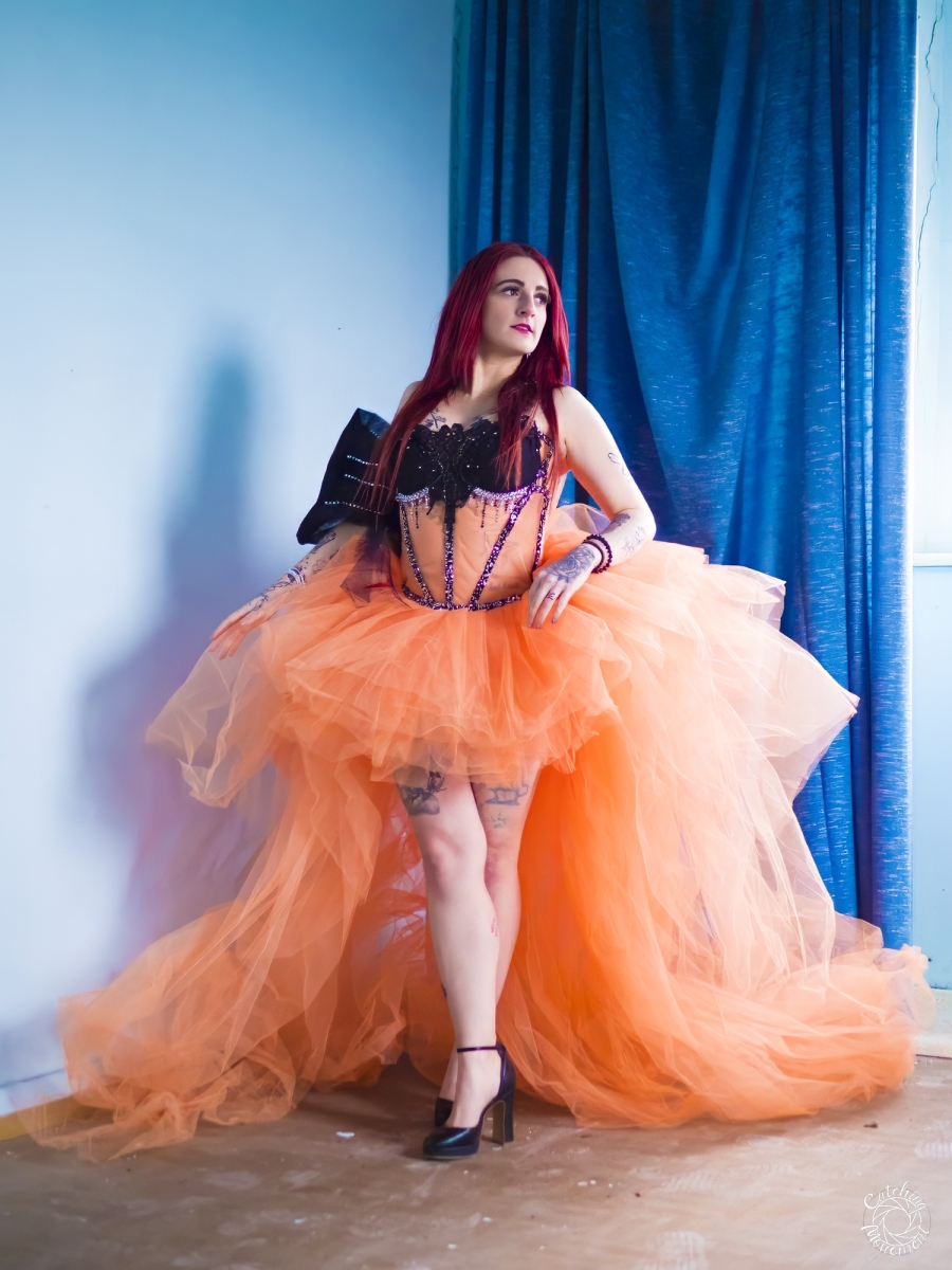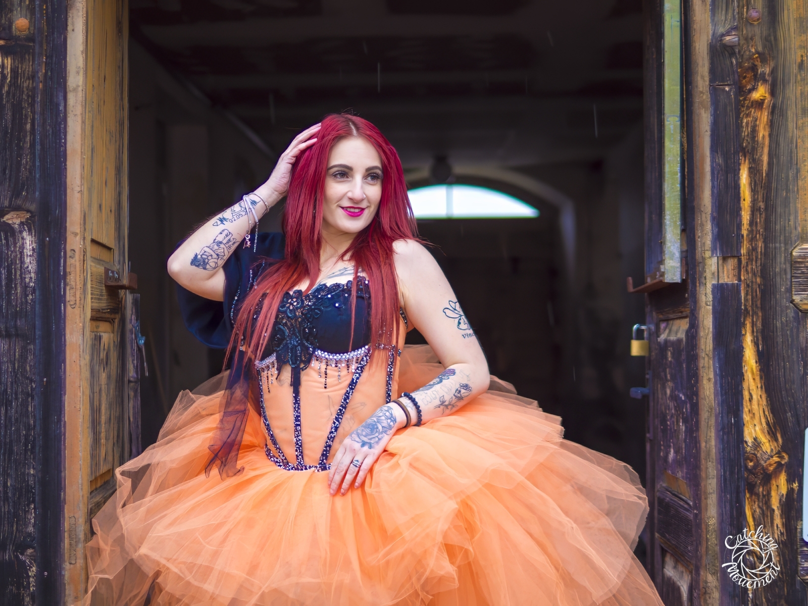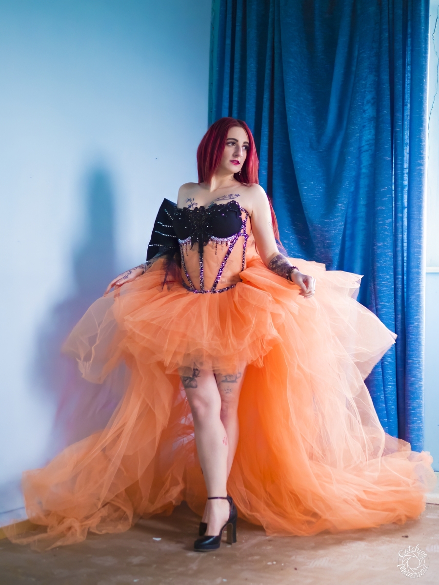 First, we went into a room with a blue wall and a long blue curtain. The corner where we took the photos nicely concealed the fact that we were actually in a lost place and that the house had been uninhabited for many years. The contrast between the blue and the orange of the dress really stood out.