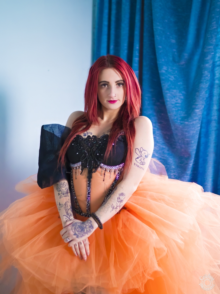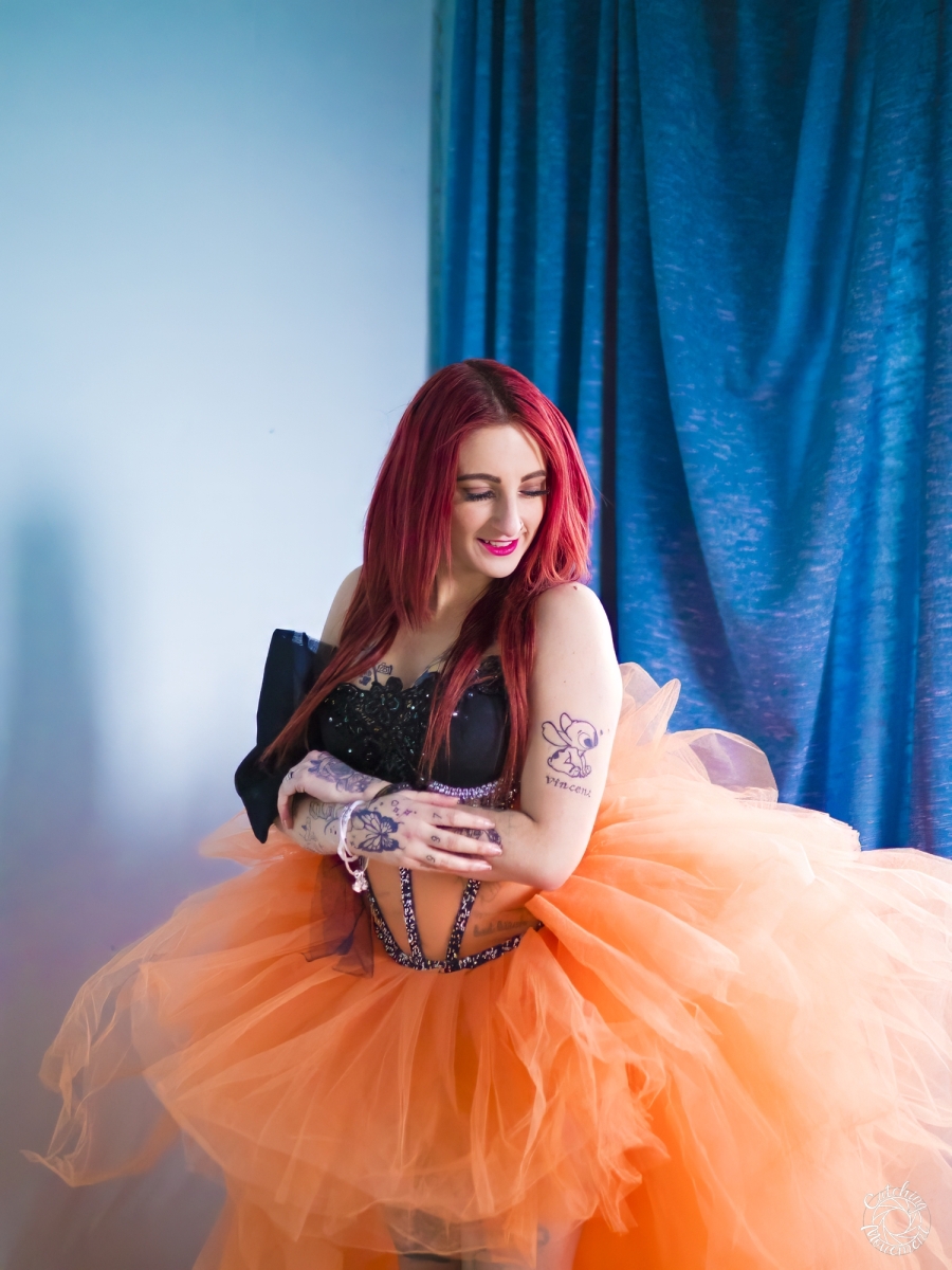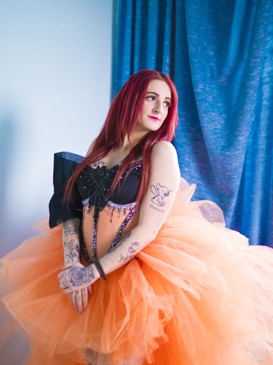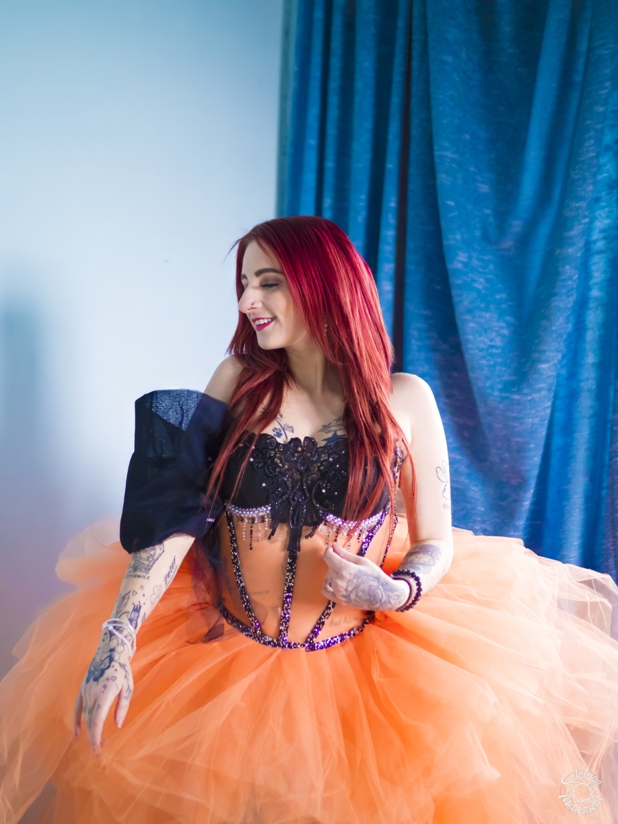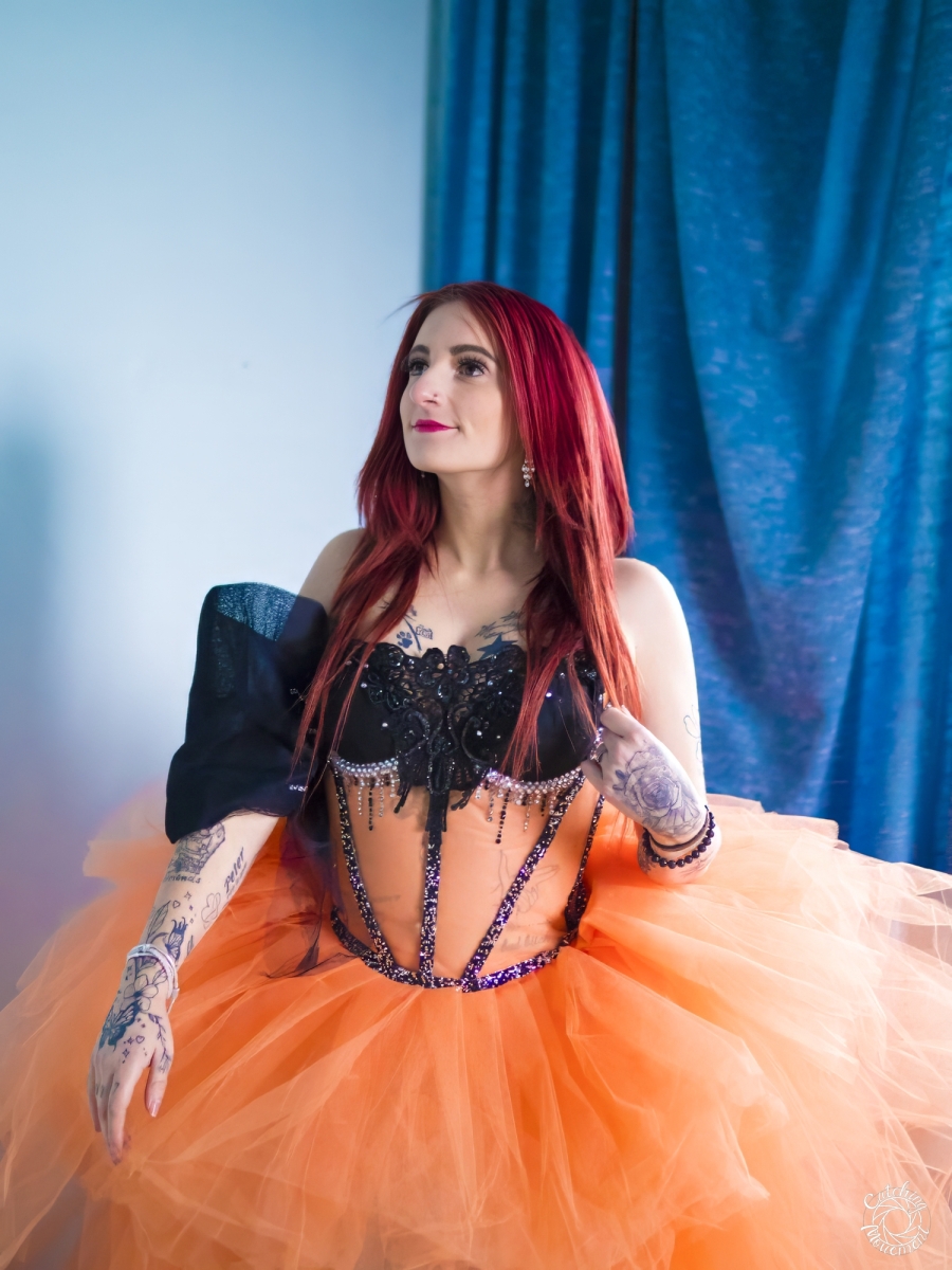 First, we went into a room with a blue wall and a long blue curtain. The corner where we took the photos nicely concealed the fact that we were actually in a lost place and that the house had been uninhabited for many years. The contrast between the blue and the orange of the dress really stood out.