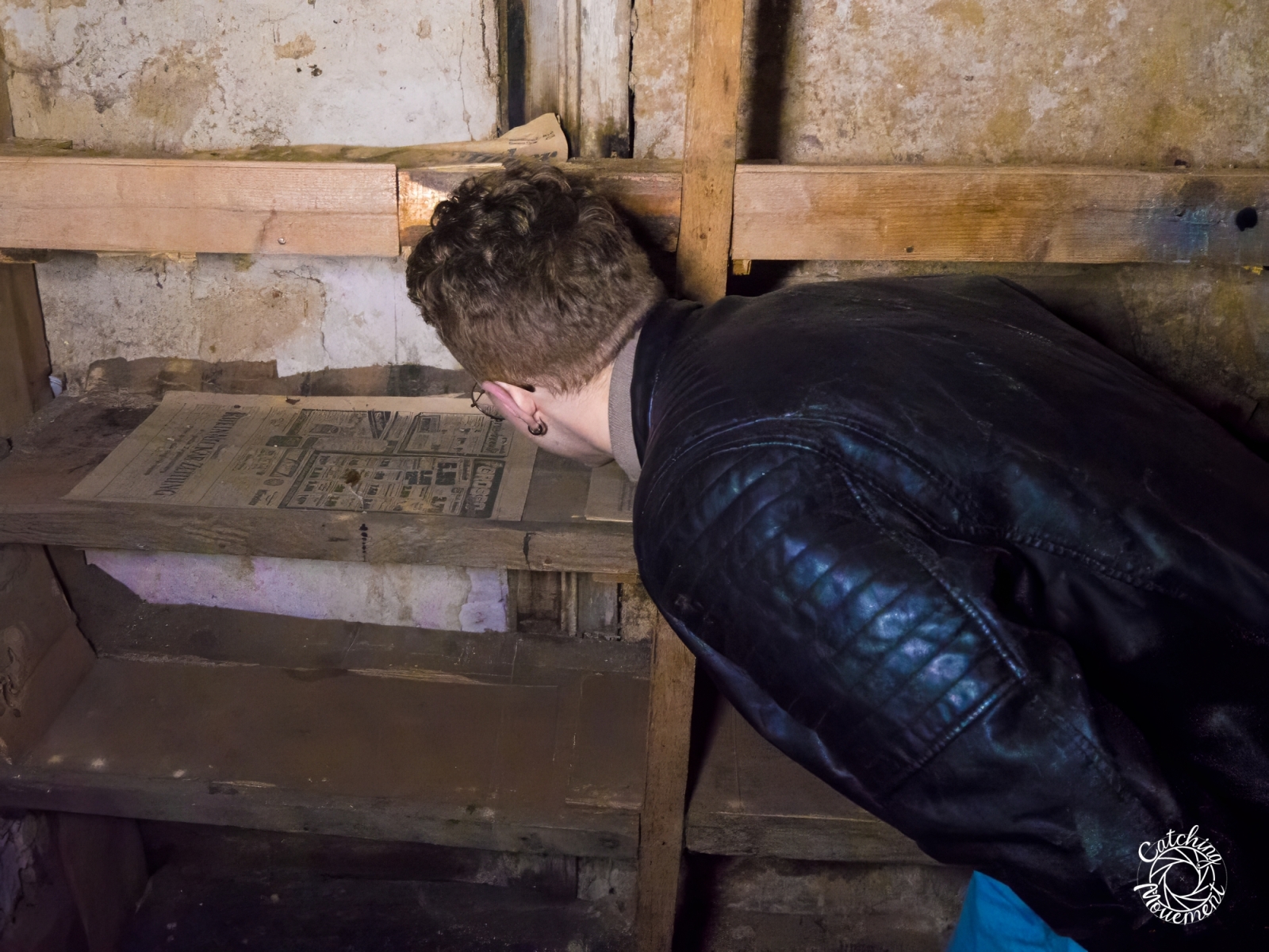 Next, we went into a room near the corridor. There was an old bathtub lying around, which we stabilized with drawers from an old desk so that Lukas could sit in it. We then took a few photos at the desk, as well as on a staircase that obviously led nowhere. Then we went to the other side of the entrance hall, where we first took a few pictures in an old dumbwaiter, followed by a storage room