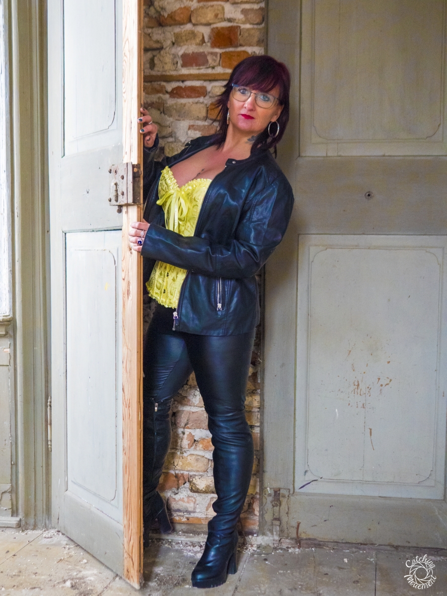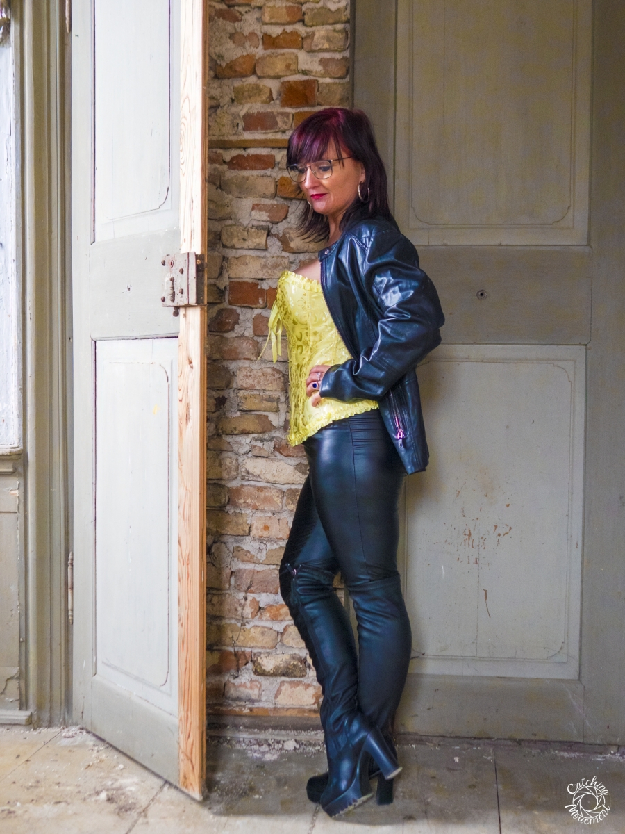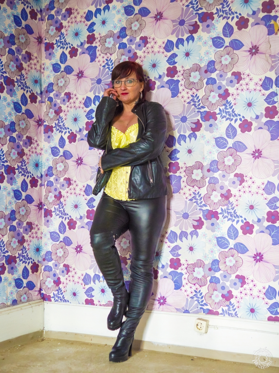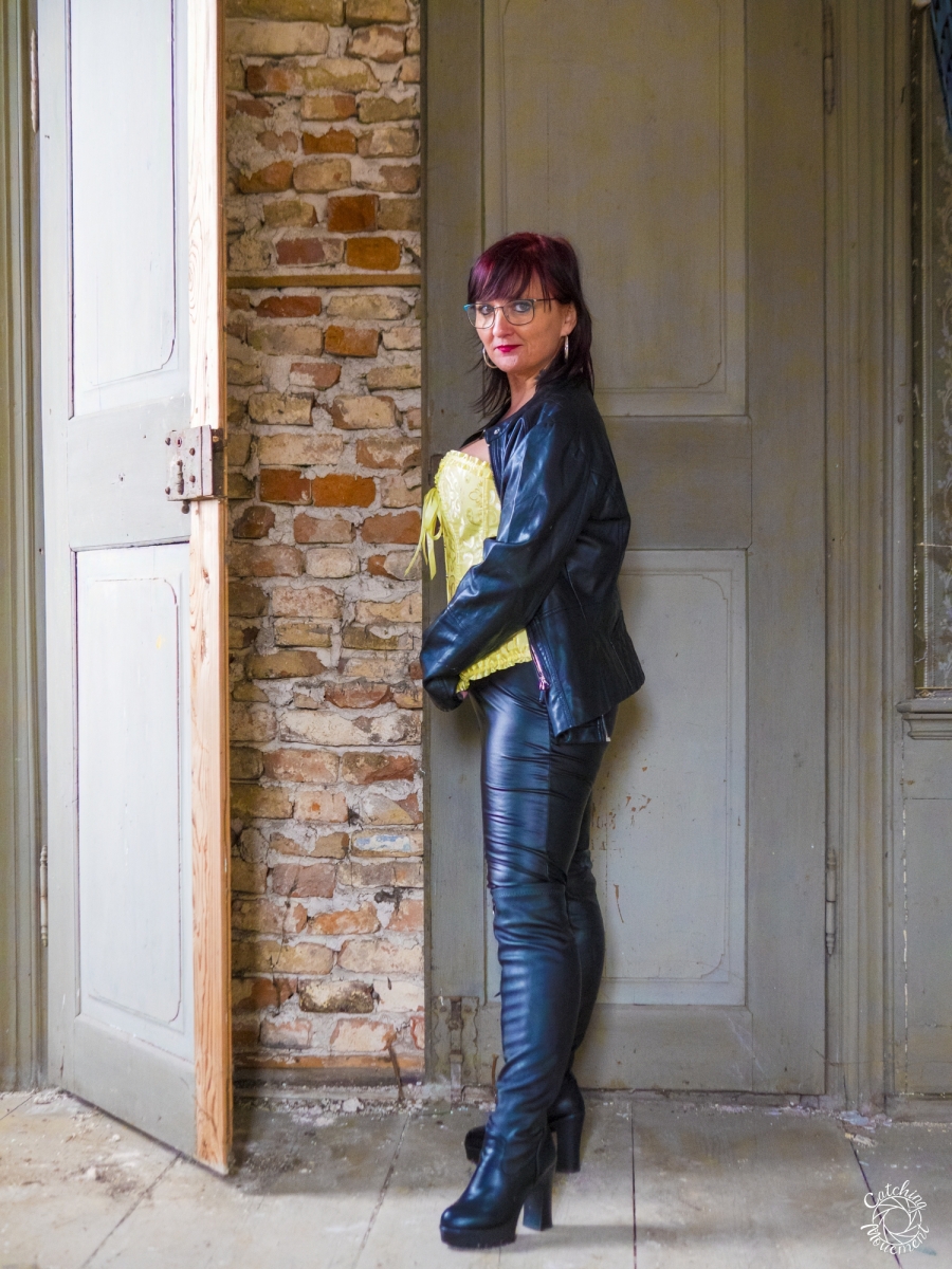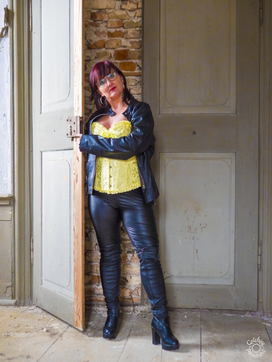 At the Lost Place photo shoot event on March 13 at Ravenstein Castle, I also had the chance to shoot two sessions with Michaela. For the first set, she wore black leather pants and a yellow corset. We took the first photos in a room with purple floral wallpaper, which provided a great contrast to the yellow corset.