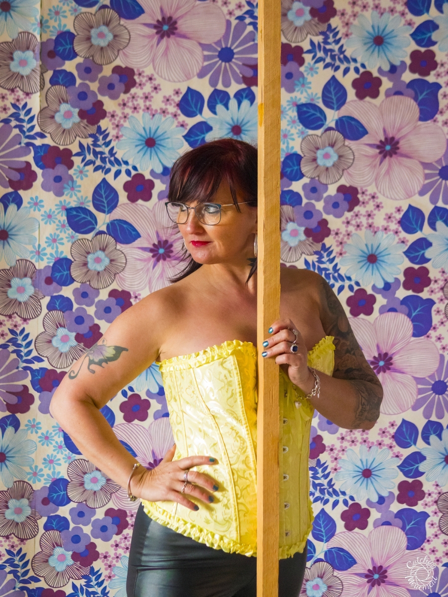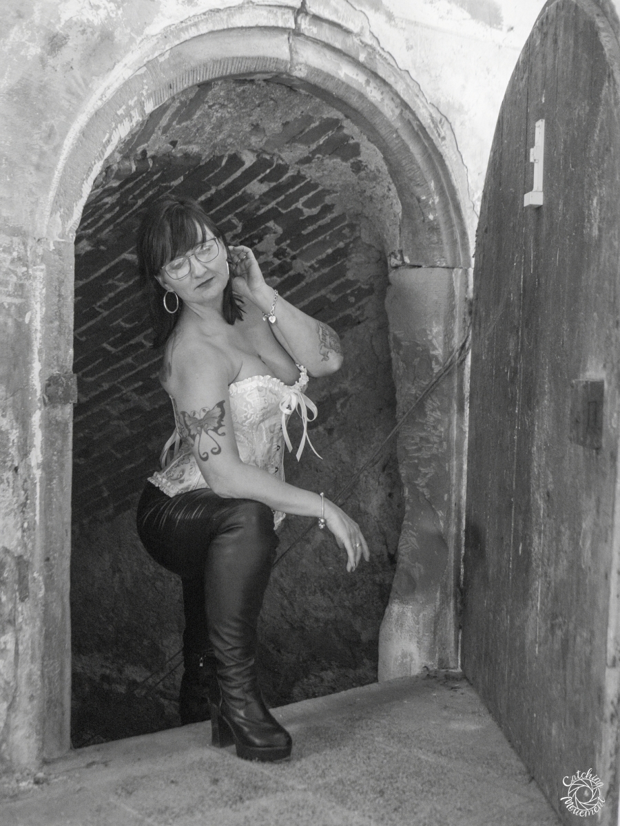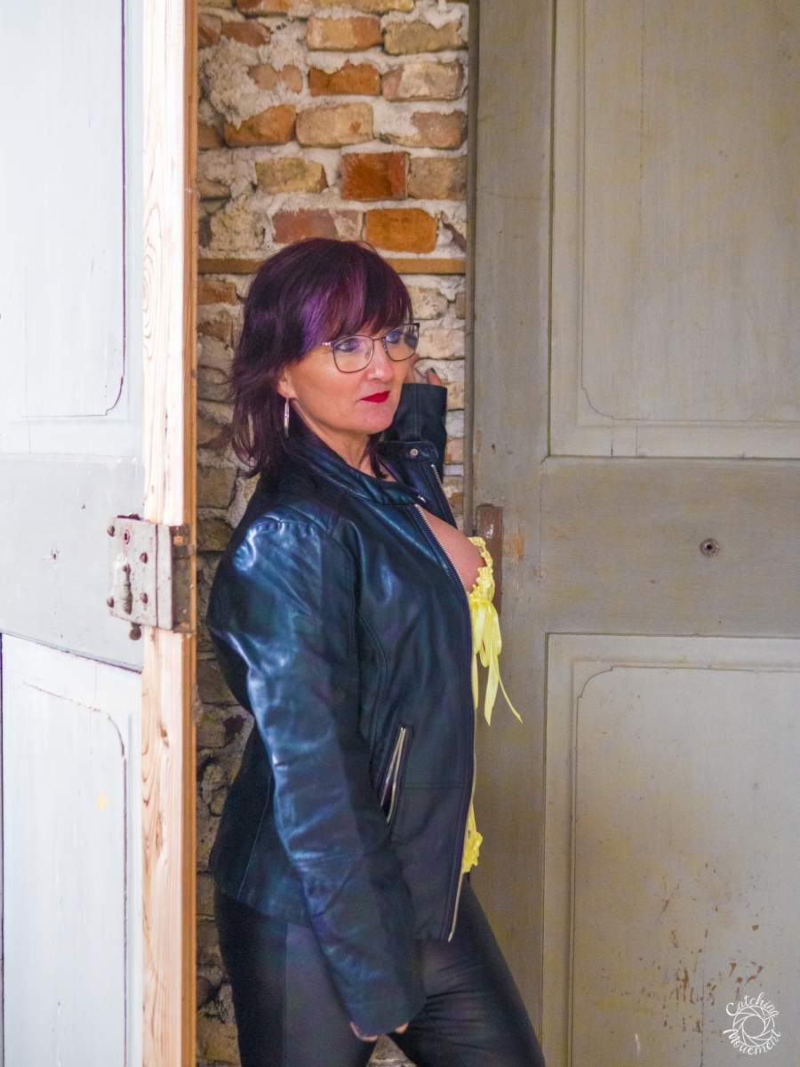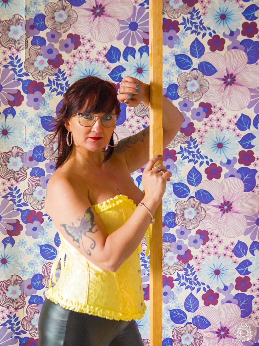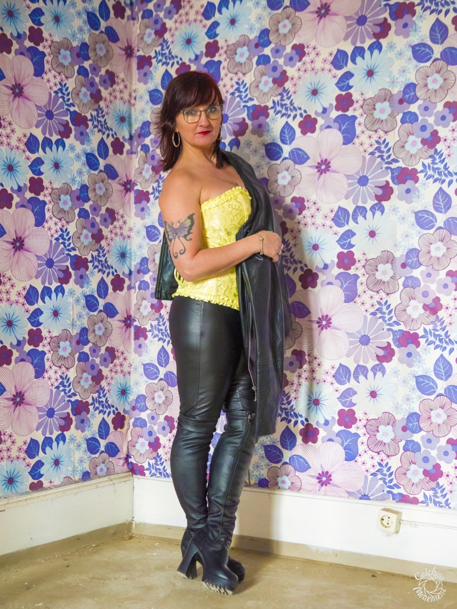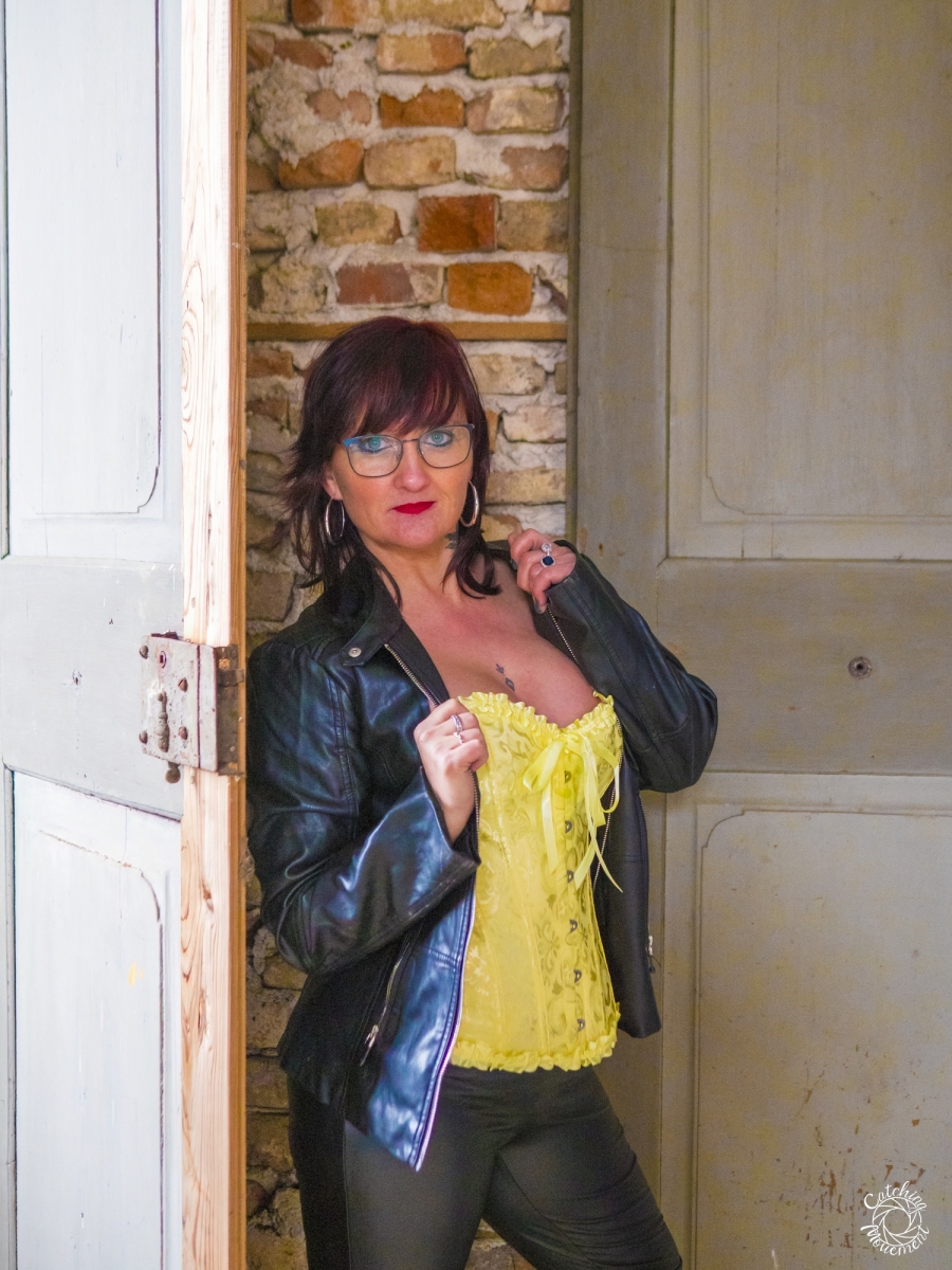 At the Lost Place photo shoot event on March 13 at Ravenstein Castle, I also had the chance to shoot two sessions with Michaela. For the first set, she wore black leather pants and a yellow corset. We took the first photos in a room with purple floral wallpaper, which provided a great contrast to the yellow corset.