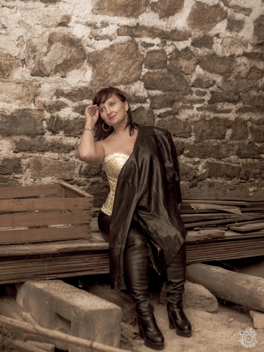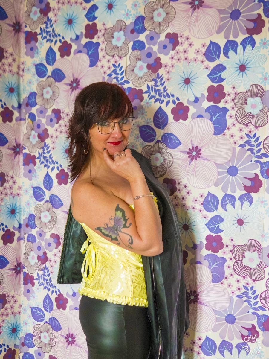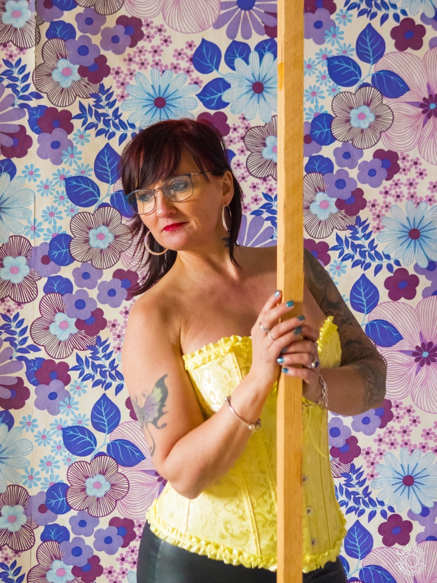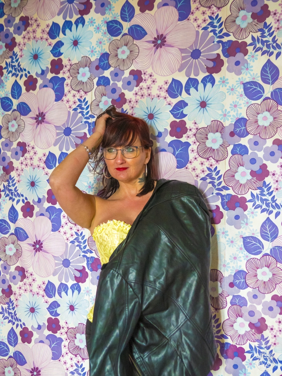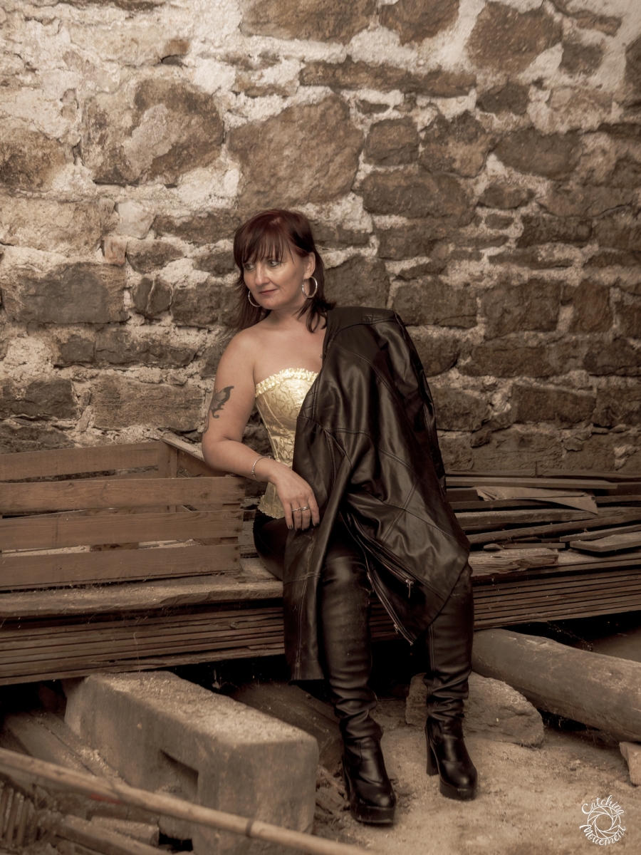At the Lost Place photo shoot event on March 13 at Ravenstein Castle, I also had the chance to shoot two sessions with Michaela. For the first set, she wore black leather pants and a yellow corset. We took the first photos in a room with purple floral wallpaper, which provided a great contrast to the yellow corset.