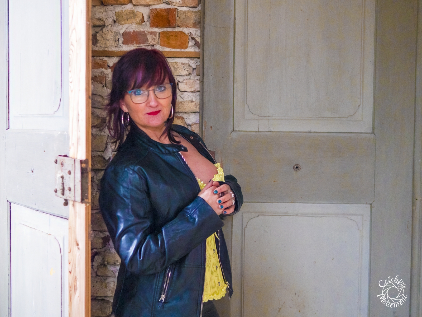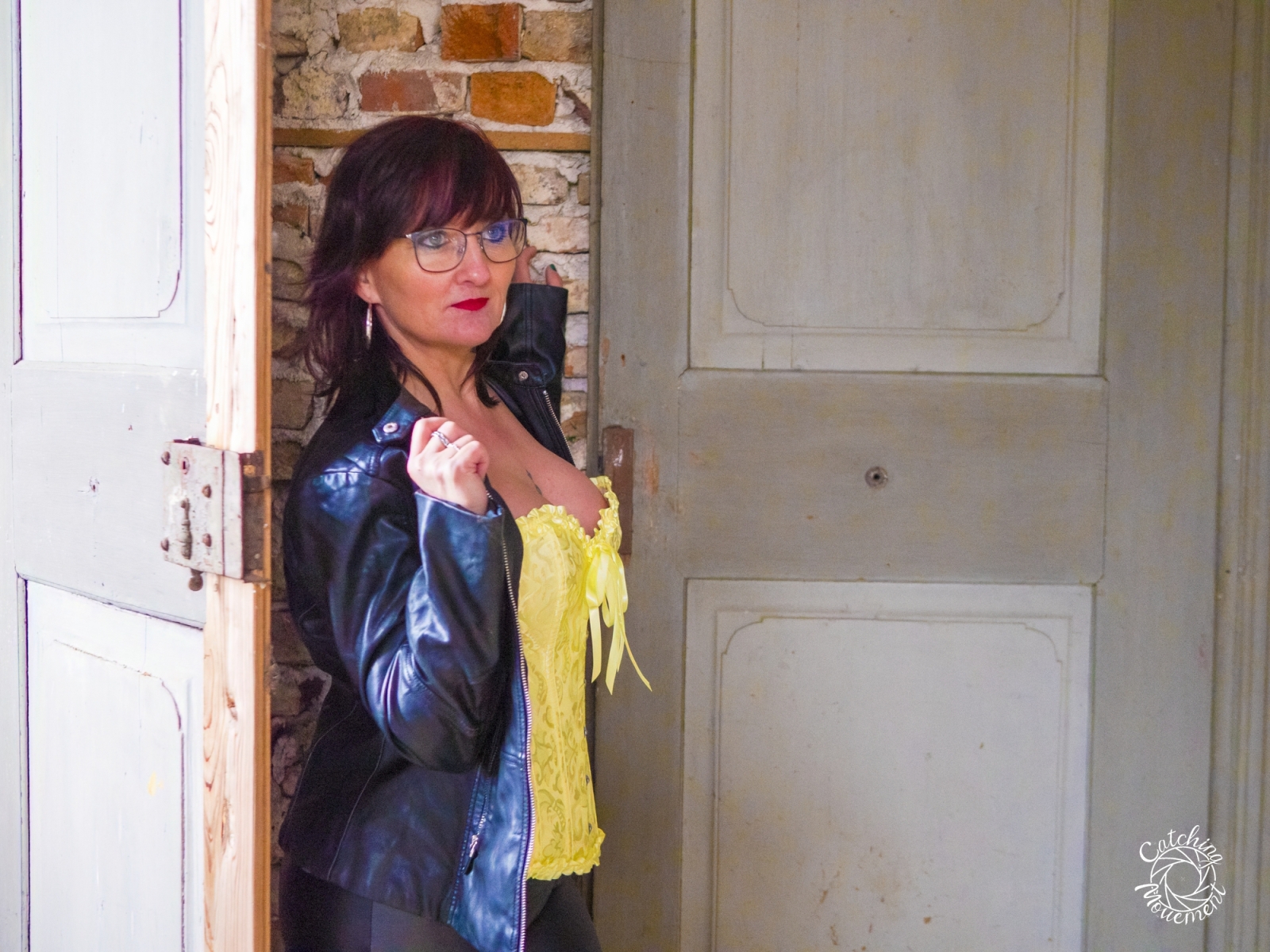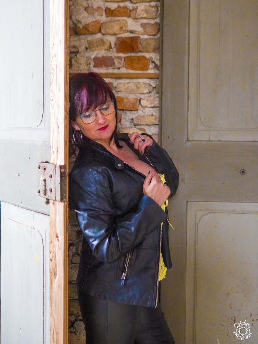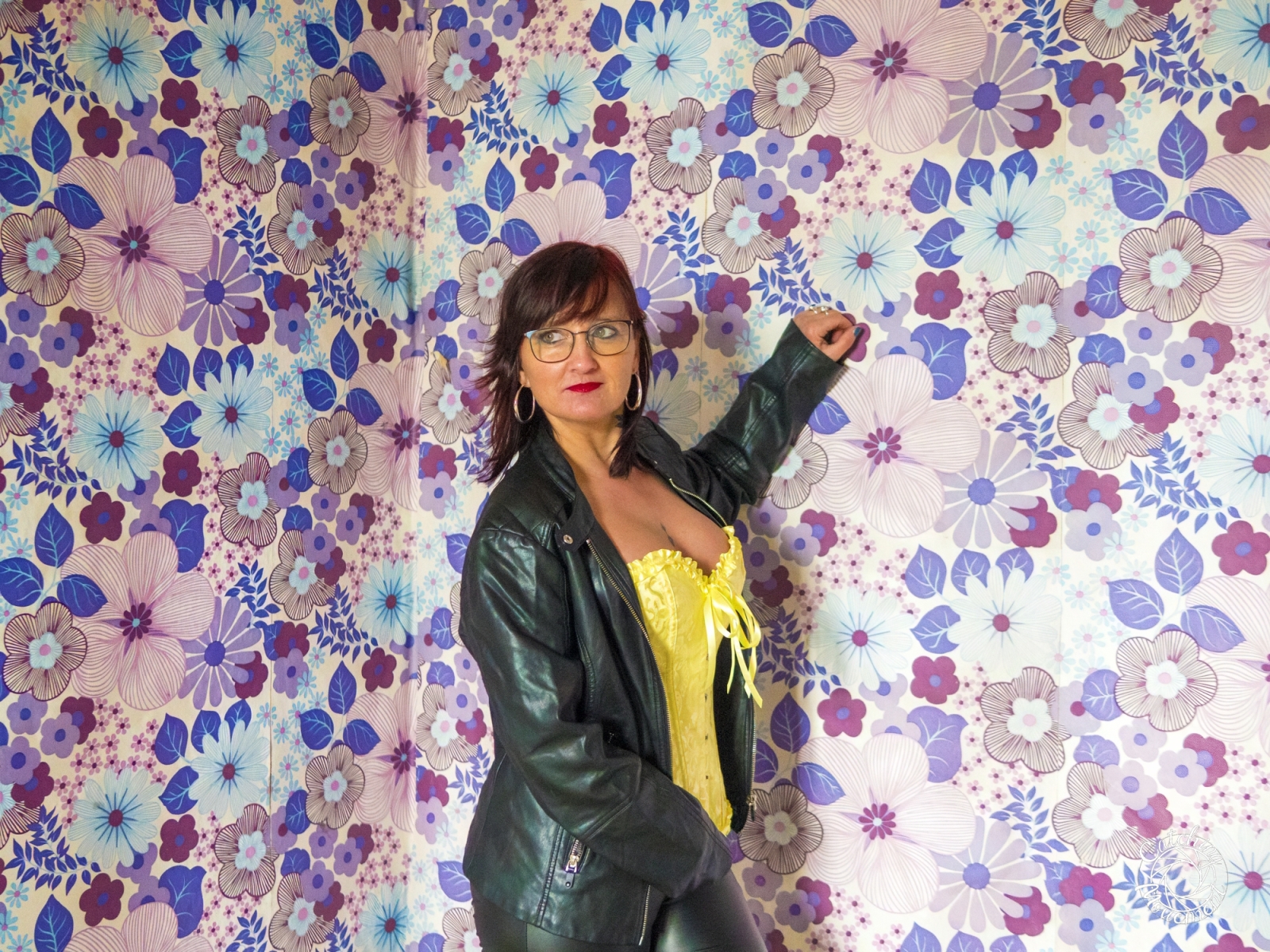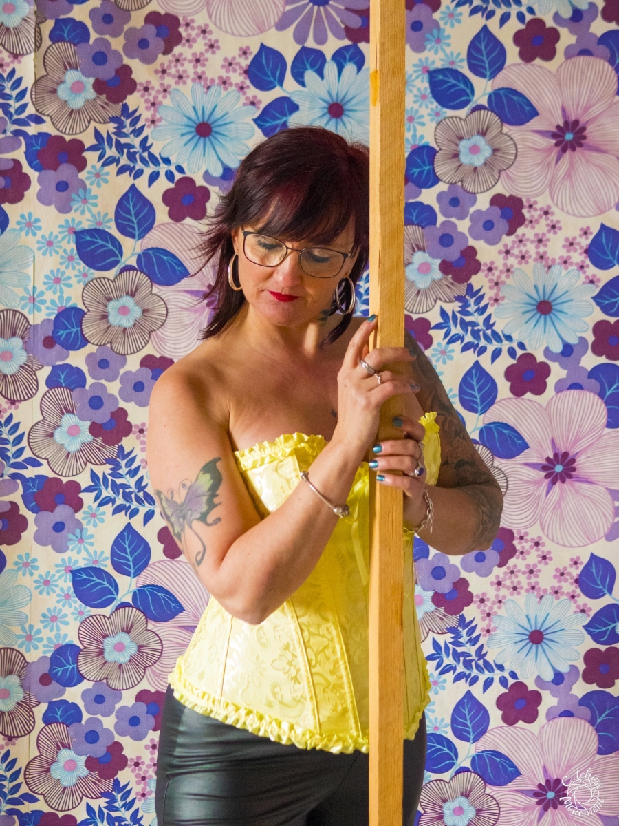 At the Lost Place photo shoot event on March 13 at Ravenstein Castle, I also had the chance to shoot two sessions with Michaela. For the first set, she wore black leather pants and a yellow corset. We took the first photos in a room with purple floral wallpaper, which provided a great contrast to the yellow corset.