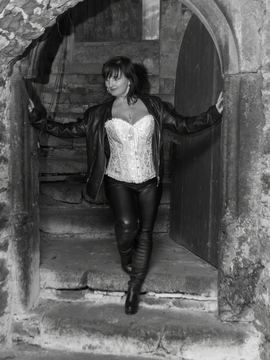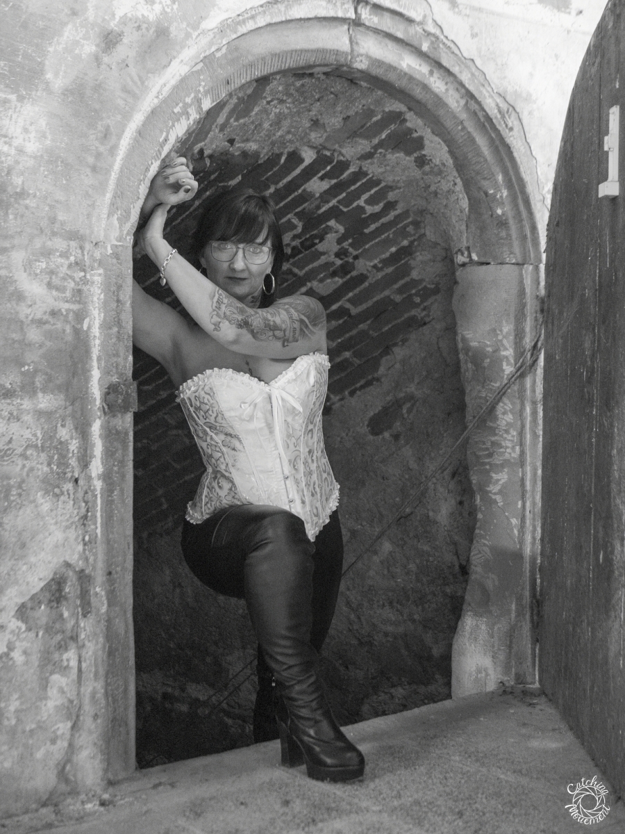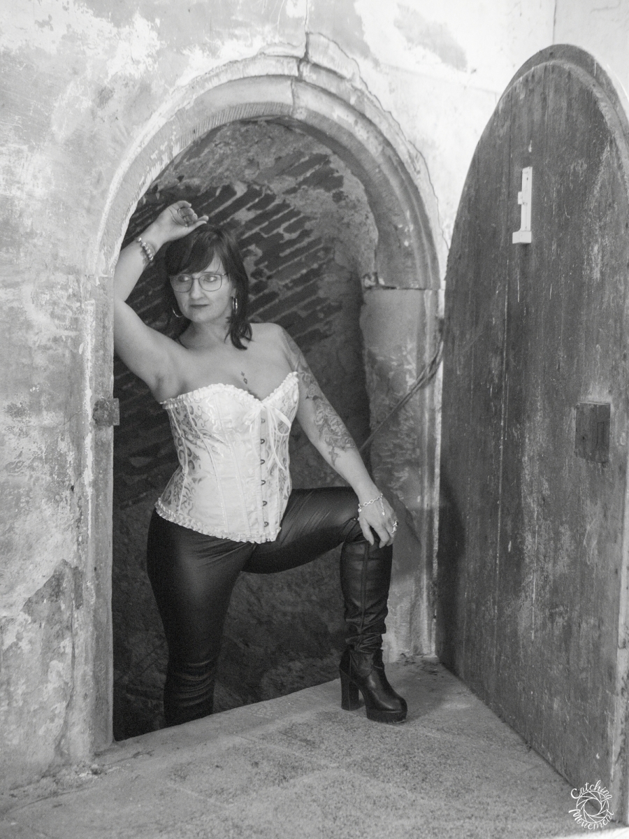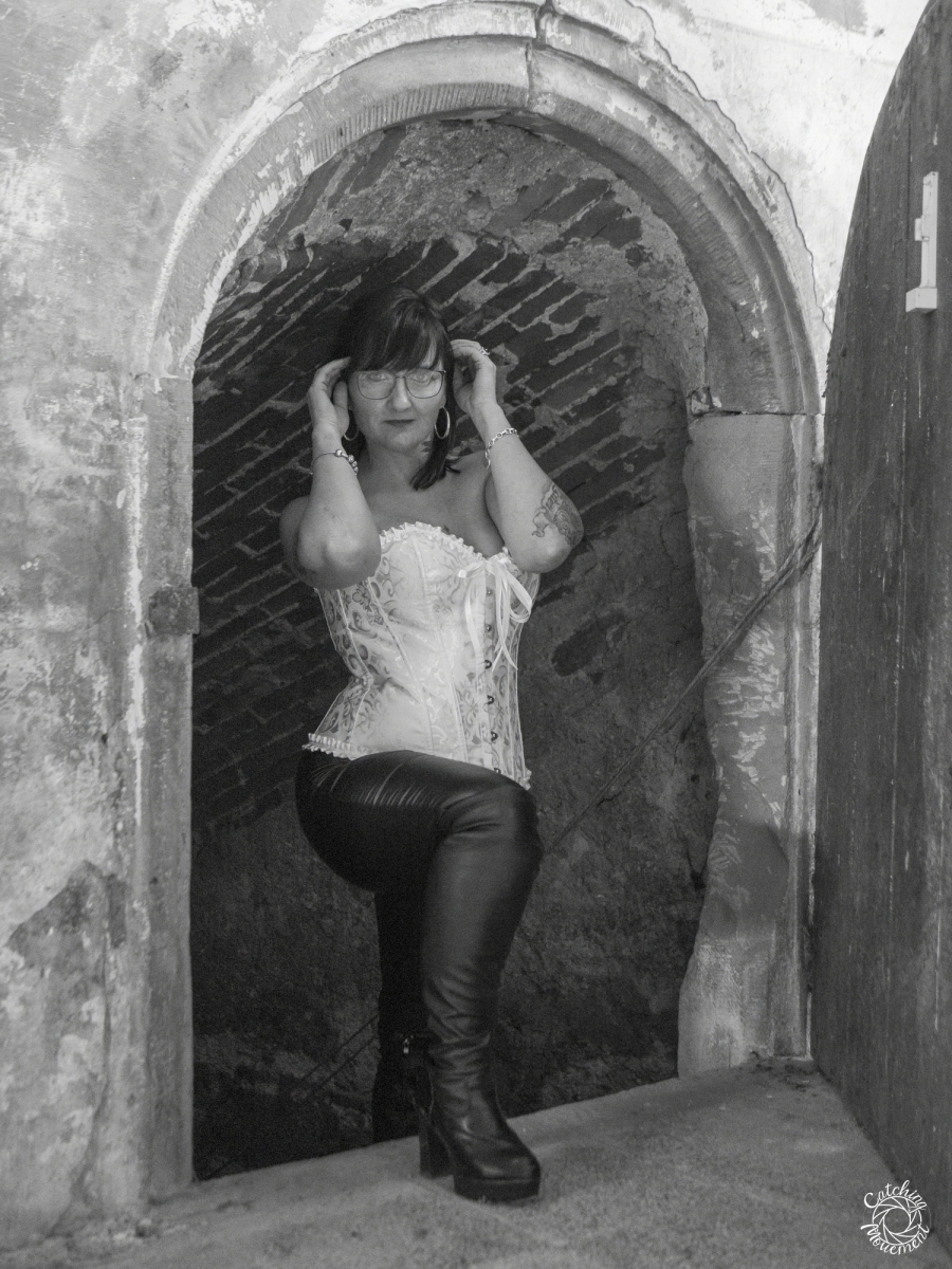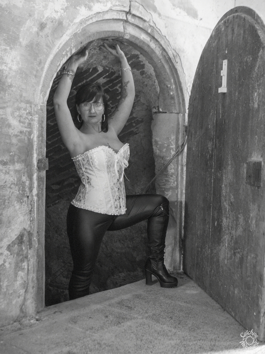 From there, we walked to the entrance of the vaulted cellar, went down into it, and finished the shooting session with the yellow corset there.